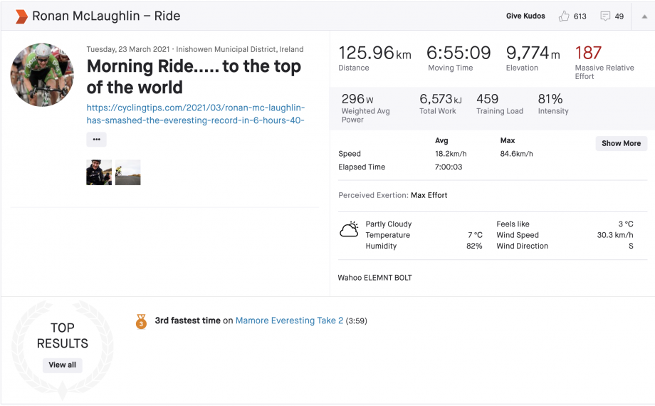 El nuevo récord se estableció el pasado martes (23 de marzo) en la misma subida que su primer récord, Mamore Gap, en la República de Irlanda. La subida tiene una infernal pendiente media del 14,2% en 810 metros, según el segmento de Strava. McLaughlin tuvo que dar 76 vueltas a la subida para llegar a la altura del Everest, pero hizo 78 por si acaso. En total, recorrió 125,96 km subiendo y bajando con una media de 296 vatios durante todo el recorrido y un máximo de 688 vatios durante un segundo. Un promedio de 3,65 w/kg.