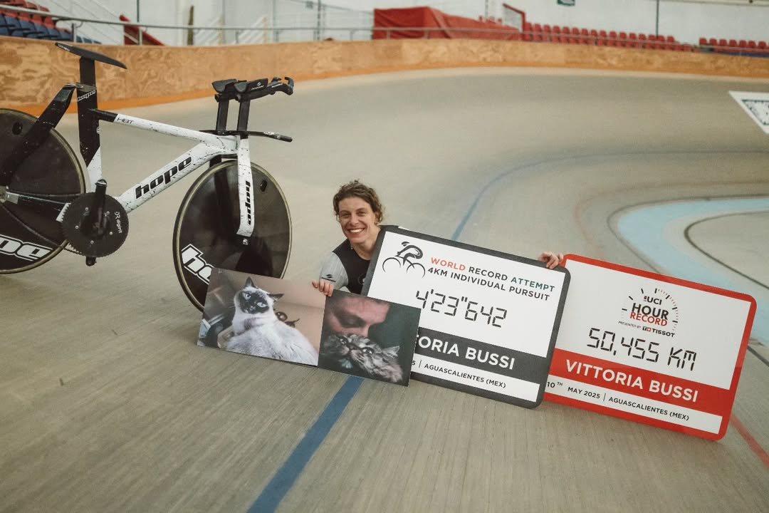 17 mayo. A su récord de la hora establecido el pasado día 10 (50,455), Vittoria Bussi añadía ayer el de los 4.000 metros, con un tiempo de 4:23.642, logrado también en la altitud del velódromo Bicentenario Juan Alfredo Morales Shaadi de Aguascalientes. Con ello superaba por 4 décimas la marca que desde el pasado mes de febrero tenía la británica Anna Morris, con 4:24.060, y que como sucedió con la plusmarca horaria, se lo dedicó a sus dos gatos. Como desgraciadamente es habitual en la ciclista transalpina, escasa información previa a sus intentos, aunque se ha sabido que el lunes realizó una primera tentativa que no logró el objetivo, pero si marcar el segundo tiempo de la historia (4:25.002) y que el miércoles tenía prevista uno nuevo, del que nada ha trascendido, antes de este tercer intento.