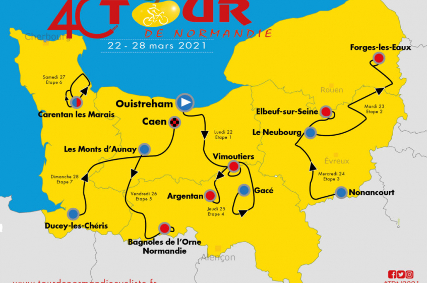9 noviembre. El Tour de Normandía 2021 -prueba francesa 2.2 UCI- ya tiene recorrido que se celebrará del 22 al 28 de marzo próximos si la pandemia lo permite.