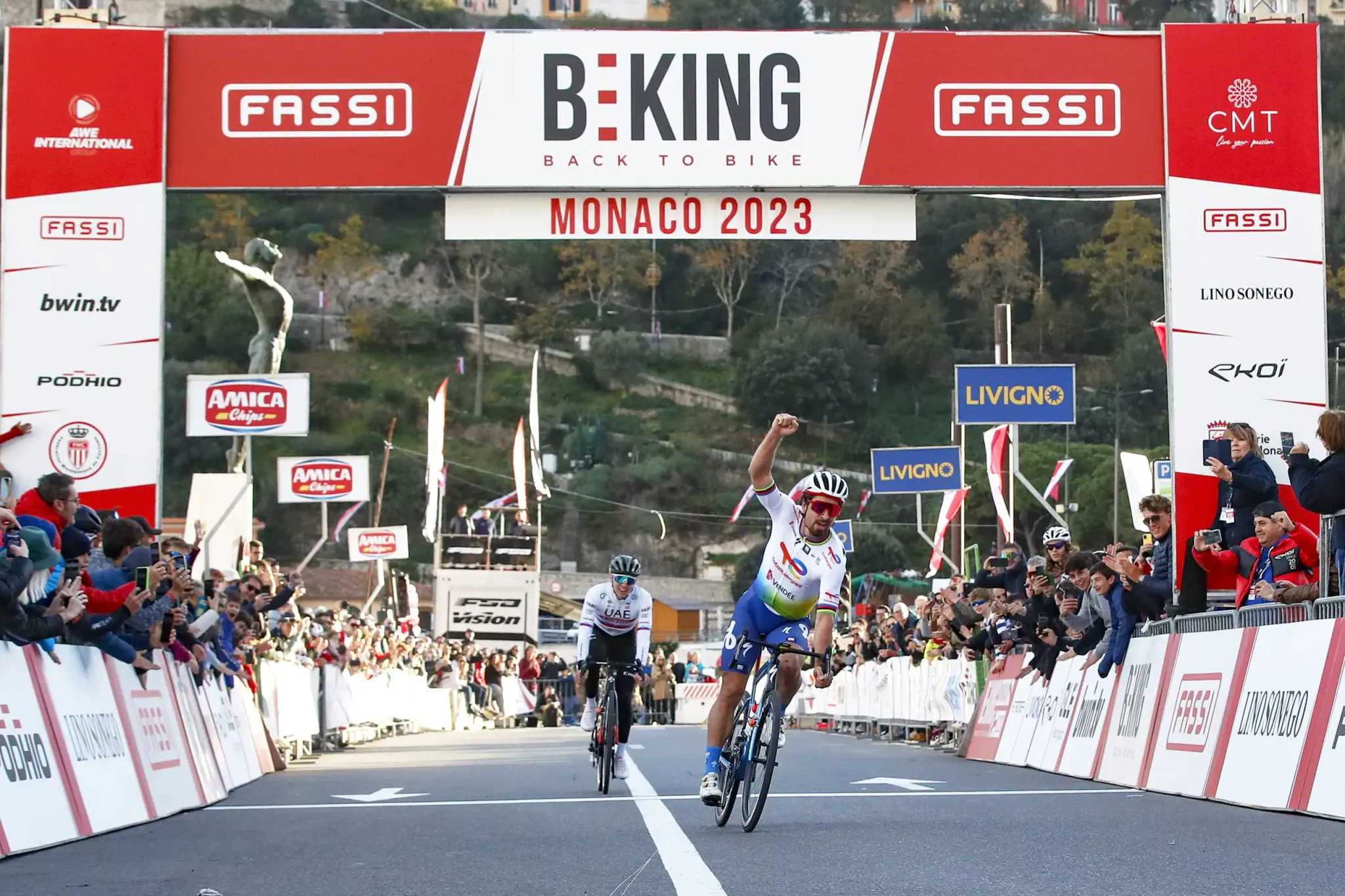 26 noviembre. Peter Sagan ha cerrado su temporada 2023, la última en la que competirá en ciclismo de carretera al máximo nivel, ganando el critérium profesional del BEKING, un evento ciclista que se organiza a final de temporada en Mónaco. El eslovaco, aún corredor del TotalEnergies, venció al sprint a Tadej Pogacar. Otro veterano velocista como Mark Cavendish completó el podio en una prueba disputada sobre un circuito de 1,3 kilómetros en el Puerto Hércules del Principado de Mónaco al que se dieron 45 vueltas para completar un total de 60 kilómetros. «Es agradable competir una vez más con mis colegas y amigos antes del comienzo de un nuevo capítulo en mi vida. Ha sido como una gran fiesta en la que estoy feliz de que también participaran todos estos aficionados y entusiastas que vinieron a Mónaco para pasar un gran día de ciclismo con sus familias», declaraba Sagan, que unas horas antes había ganado también en la prueba por parejas, donde compitió junto a Samuele Battistella. En esta carrera, la segunda posición fue para Matteo Trentin y Luke Rowe y la tercera, para Michael Matthews y Matteo Moschetti.
