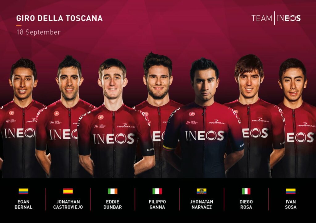16 septiembre. Egan Bernal que -criteriums aparte- no compite desde que abandonó la Clásica de San Sebastián el pasado 3 de agosto, vuelve a la competición en Europa y en Italia con el tríptico compuesto por el Giro de Toscana (18 septiembre), Copa Sabatini (19) y Memorial Pantani (21) para preparar el Mundial de Yorkshire. Al lado del colombiano y ganador del Tour de Francia estarán Jonathan Castroviejo, Eddie Dunbar, Filippo Ganna, Jonathan Narváez, Diego Rosa e Iván Sosa.