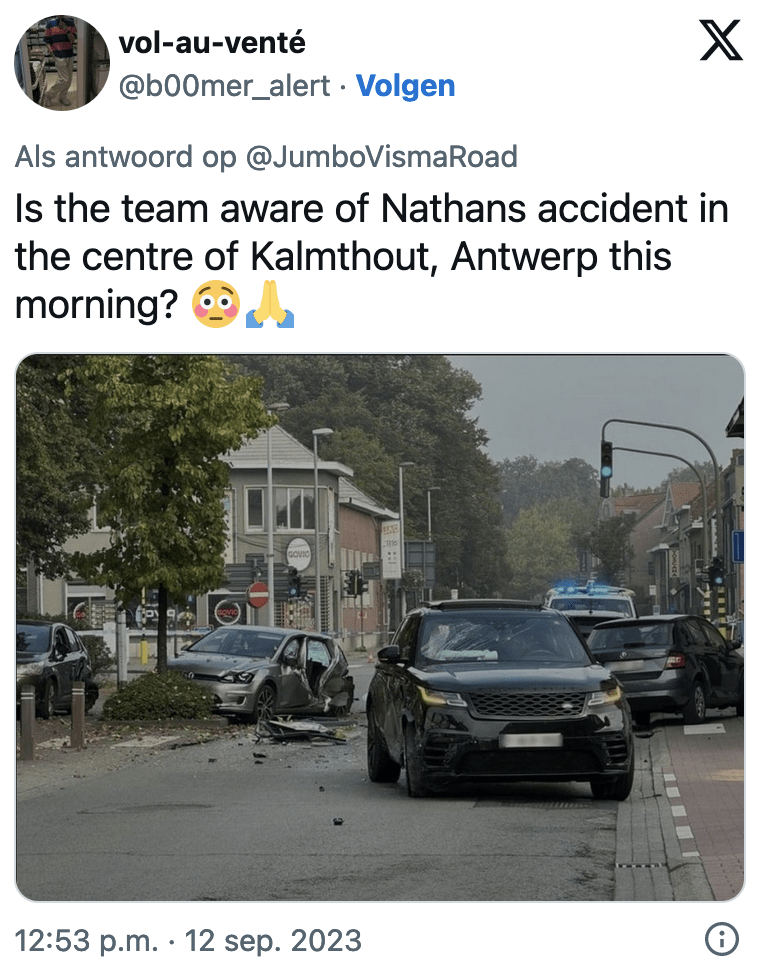 Ya entrada la tarde, el equipo Jumbo emitió un breve comunicado a través de sus redes sociales actualizando el estado de salud del corredor belga. «Nathan Van Hooydonck está despierto y no sufre heridas debido al accidente de tráfico de hoy. Su situación de salud no es crítica. Se realizarán más exámenes médicos para determinar por qué Nathan se sintió mal mientras conducía su coche. Queremos agradecer a todos por los mensajes y al personal médico del hospital por cuidar tan bien a Nathan y su familia».