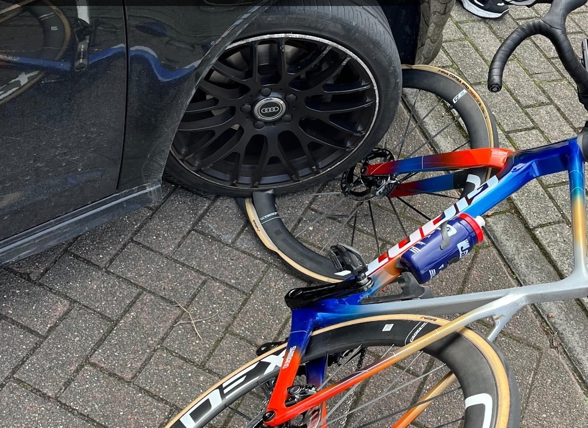 24 septiembre. Luka Mezgec fue atropellado este lunes mientras entrenaba en Bélgica, por fortuna, sin consecuencias para él, aunque sí para su bicicleta. El esloveno, que se encuentra preparando el Mundial de Zúrich de este domingo, salió a rodar junto a su compañero Elmar Reinders (Jayco-AlUla) y horas después publicó en sus redes sociales una imagen de su bicicleta, con la rueda delantera aplastada por un vehículo. «He agotado una de mis nueve vidas de gato. Gracias a todos por sus pensamientos, me salí con la mía», escribía en tono tranquilizador, mostrando que únicamente había sufrido un pequeño corte en su pierna izquierda.
