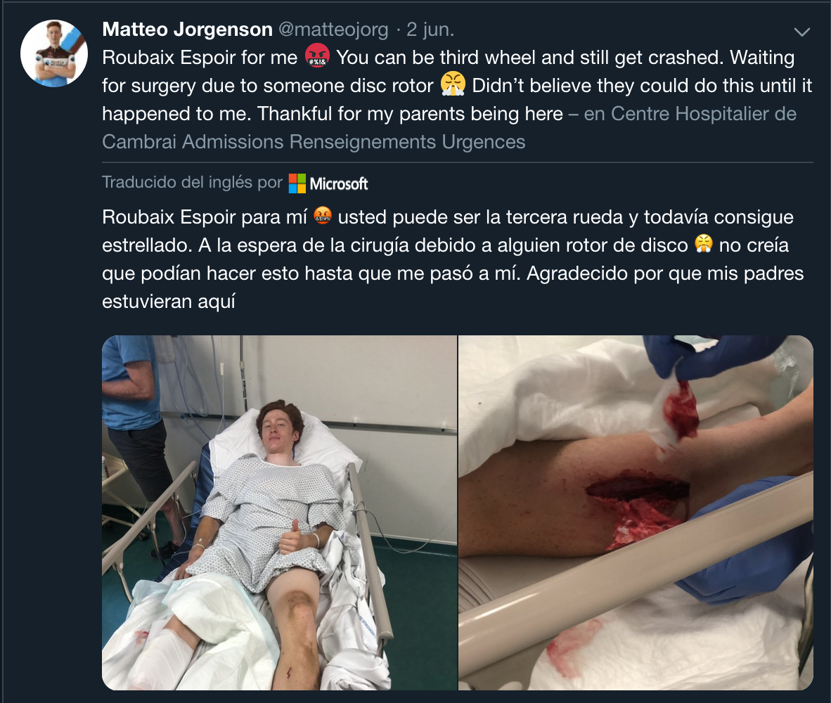 3 junio. La polémica en torno a los frenos a disco continúa, y no cesará mientras haya víctimas cortadas por las afiladas cuchillas que dichos implementos contienen. La última novedad llega desde Francia, donde un sub-23 acabó en el hospital gravemente lastimado. Matteo Jorgenson, del Chambéry CF (filial del Ag2r La Mondiale) se cayó en cabeza de pelotón durante la París-Roubaix sub-23 y, de inmediato, entendió lo que había sucedido. «Un oponente se cayó frente a mí en una curva a la derecha y me árrastró a gran velocidad», dijo. «Cuando me levanté vi los frenos de disco del otro ciclista y mi zapato completamente ensangrentado. Nada podría haberse cortado de forma tan precisa y con una profundidad de cuatro centímetros», añadió. No es la primera vez que ocurre un incidente de este tipo y la disputa volverá a plantearse. La primera vez fue en 2016, cuando Francisco Ventoso denunció algo similar después de una caída en París – Roubaix. / Ciclismointernacional