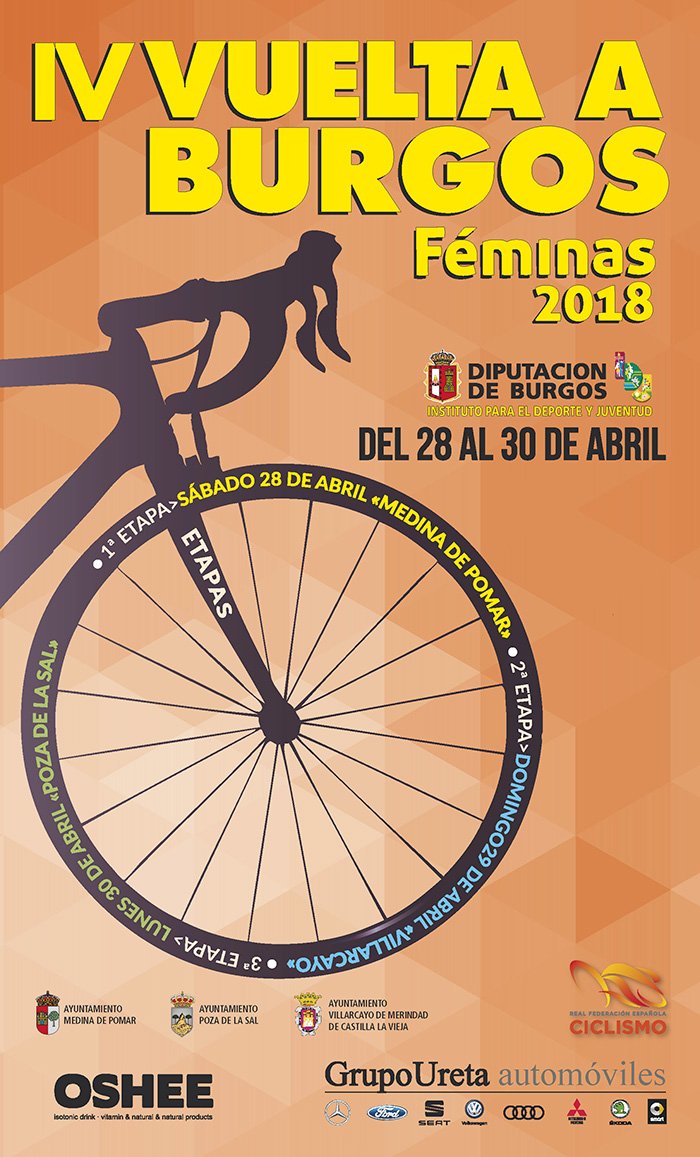 30 marzo. Desveladas las etapas de la Vuelta a Burgos Féminas, del 28 al 30 de abril. La cuarta edición de la ronda burgalesa para mujeres arrancará el sábado 28 de abril en Medina de Pomar. Al día siguiente, el domingo 29, se disputará la segunda jornada bajo la denominación de Gran Premio de Villarcayo. El lunes 30, el Gran Premio Poza de la Sal proclamará a la sucesora de Eider Merino, vencedora en 2017.