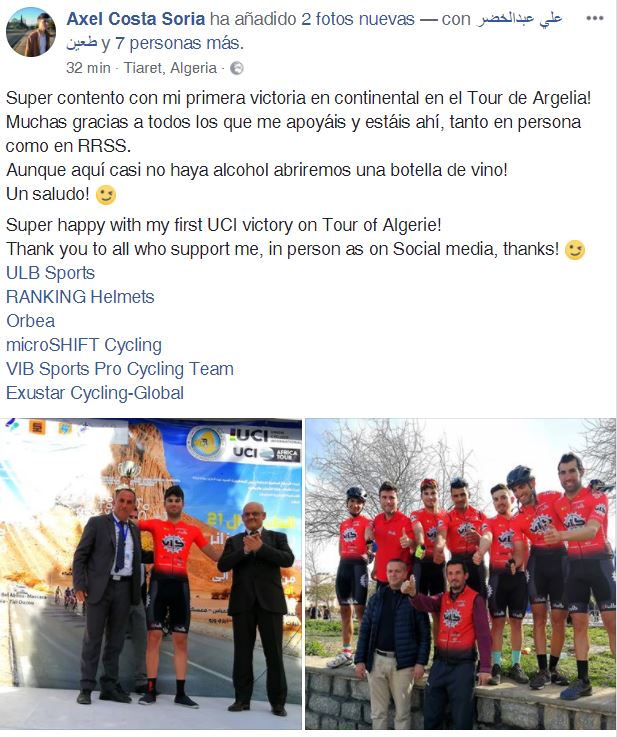 29 marzo. El hispanoargentino Axel Costa obtiene su primer triunfo continental en el Tour de Argelia. El corredor de 23 años, nacido en Benejúzar (Alicante) es hijo de padre argentino -el exciclista Pablo Costa- y madre española, pero compite con licencia del país sudamericano desde hace dos años. Costa consiguió el triunfo en la tercera etapa de la ronda argelina UCI 2.2, con salida en Mascara y meta en Tiaret tras 157 kilómetros de recorrido, y dedicó el triunfo a sus compañeros del VIB Sports Pro Cycling Team, entre los que se encuentran el granadino Gabriel Reguero y el valenciano Eric Valiente.