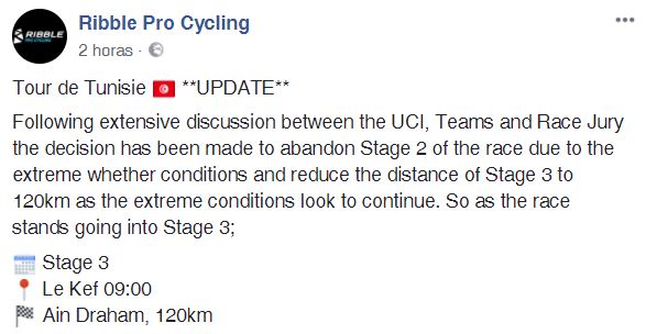21 marzo. La segunda etapa del Tour de la Farmacia Central de Túnez, anulada al cruzar la línea de meta sólo siete corredores. La jornada de la ronda tunecina categoría UCI 2.2, entre Kairouan y Le Kef (167 kilómetros) finalizó con victoria del belga Gaëtan Bille. No obstante, su equipo, el Sovac Natura4ever -en el que milita el veterano Davide Rebellin, que también participa en la prueba- ha anunciado que la etapa ha sido cancelada y que la etapa siguiente, la tercera, arrancará como lo hizo la segunda, con Youcef Reguigui como portador del maillot amarillo de líder. Sólo siete corredores, de los 40 que terminaron el primer día, han logrado cruzar la meta debido a las inclemencias meteorológicas: temperaturas de 0 grados, lluvia torrencial en ocasiones convertida en aguanieve y fuertes vientos, por lo que se ha aplicado el protocolo de clima extremo. Además, según ha publicado otro de los equipos participantes, el Ribble Pro Cycling, ha sido recortada por los mismos motivos de 172 a 120 kilómetros.