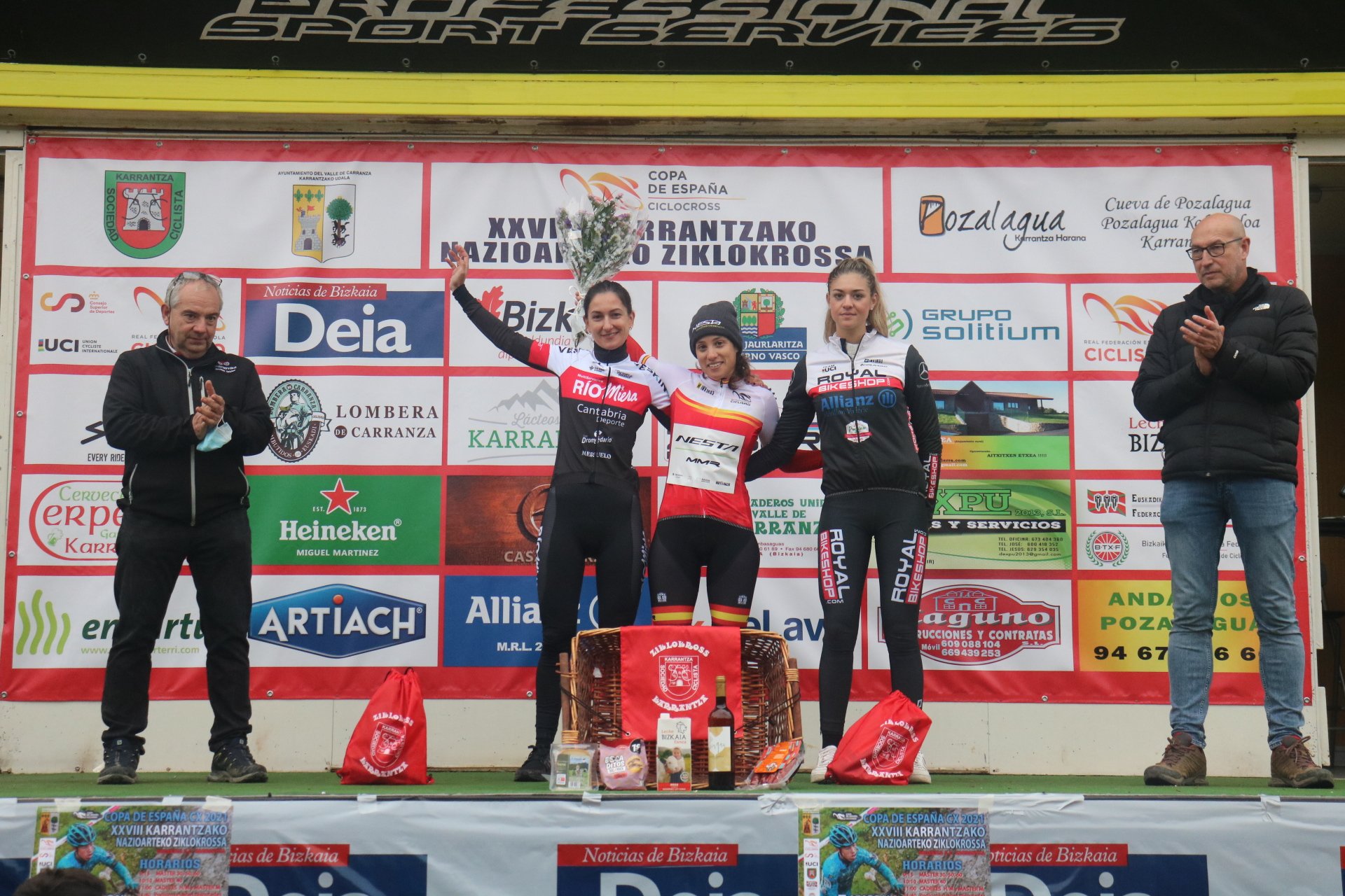 En lo que respecta a las féminas, en Karrantza se vivió una bonita carrera con una clara dominadora como fue el caso de Lucía González, quien se quiso resarcir de su cuarto puesto en Llodio. La asturiana salió muy fuerte desde el inicio junto con Alessia Bulleri y Anais Morichon, mientras que Aída Nuño sufría tras una mala salida. A medida que pasaban las vueltas, el trío de cabeza se iba alternando hasta que a mitad de carrera, la corredora de Nesta dio un golpe sobre la mesa y se despegó de sus rivales. Por detrás, Sara Cueto aparecía tras una fantástica remontada y llegó a alcanzar la segunda plaza y pelearla con la vencedora en el día de ayer. Sin embargo, la reacción de la líder de la competición, Aida Nuño, estaba por esperar, y la asturiana empezó una remontada desde la quinta plaza. Por su parte, Lucía González llegaba en solitario a la meta, mientras que, a 18 segundos, en la última curva aparecía Aida Nuño para sobrepasar a Morichon y llevarse la segunda plaza por delante de la gala. González, por tanto, se volvía a vestir de líder en esta tercera prueba de la competición.
