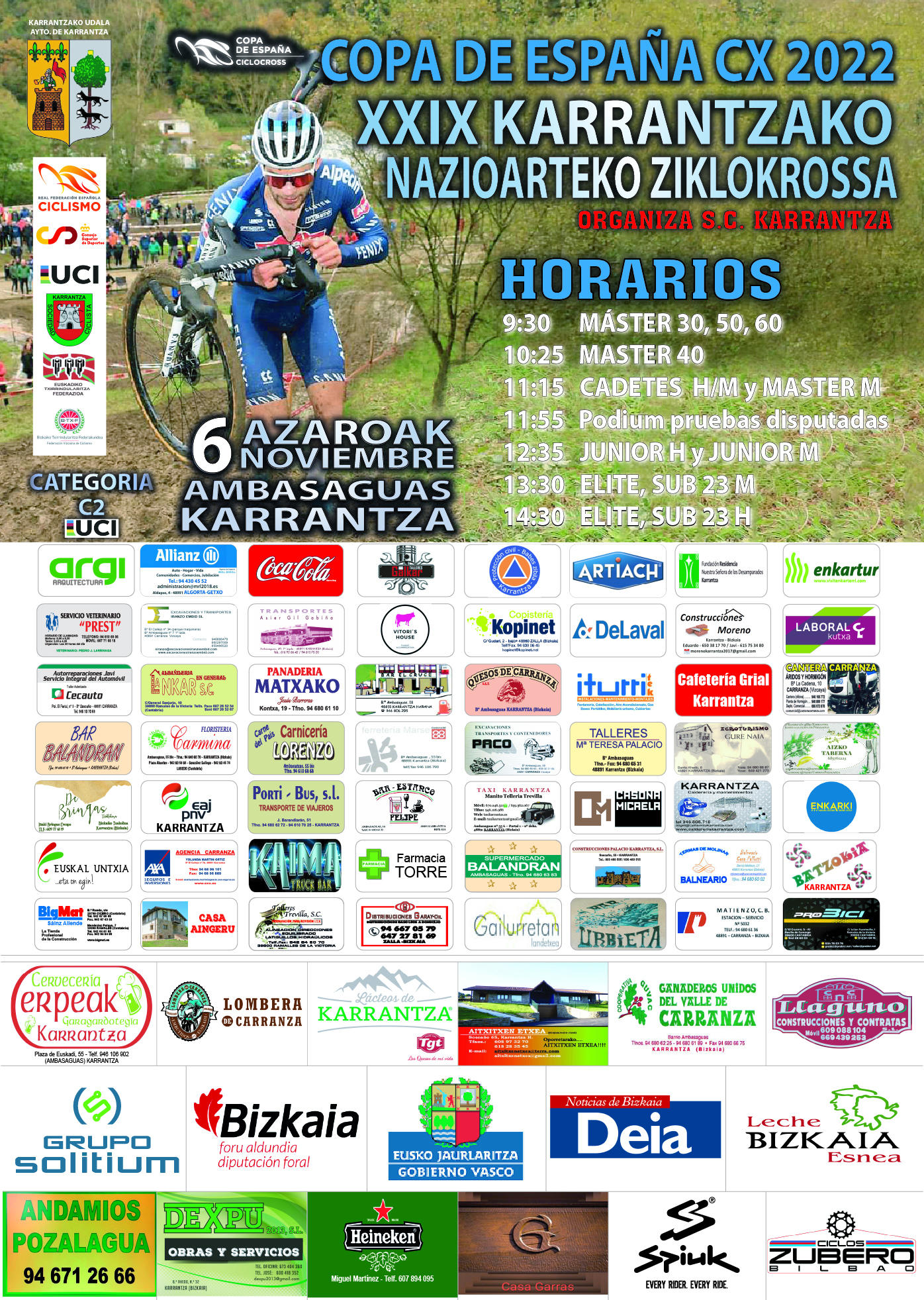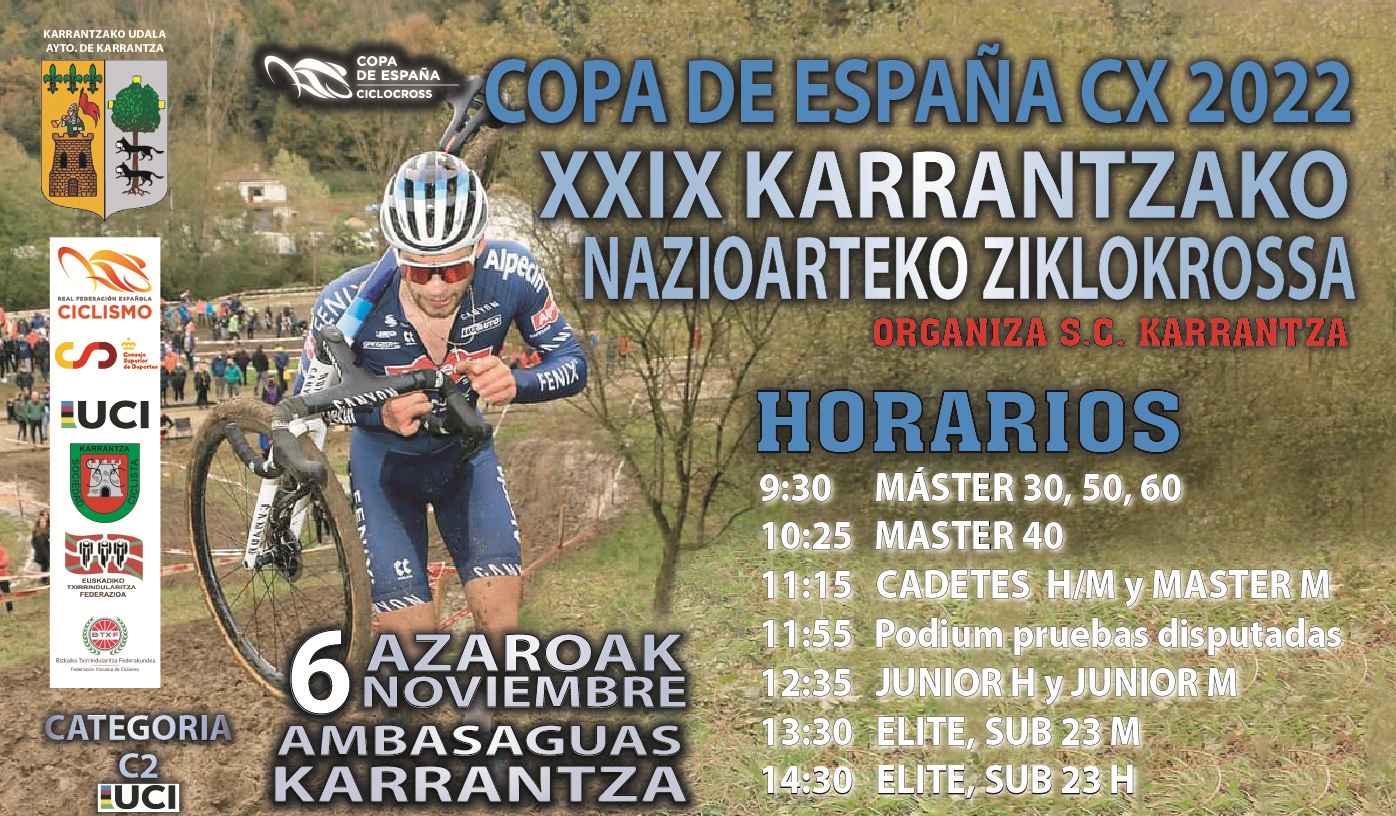 La 29ª edición del Ciclocross Internacional de Karrantza será escenario el domingo 6 de noviembre de la quinta prueba de la Copa de España de Ciclocross entre las de Llodio y Tarancón. Organizada por la Sociedad Ciclista Karrantza, la ya clásica prueba del calendario nacional será de categoría UCI C2. David Van der Poel y Lucía González son los vigentes campeones.