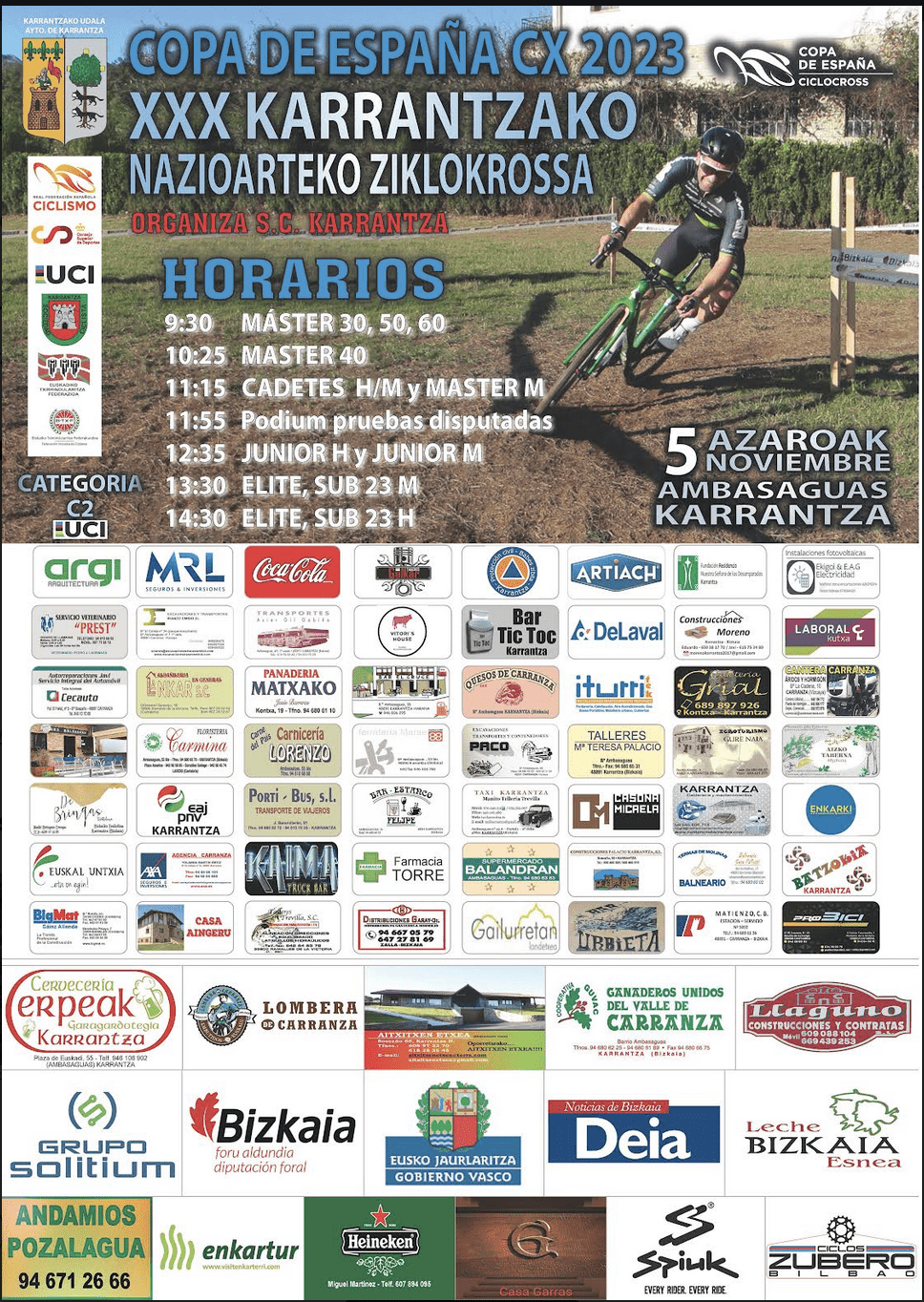La 30ª edición del Ciclocross Internacional de Karrantza será escenario el domingo 5 de noviembre de la quinta prueba de la Copa de España de Ciclocross entre las de Les Franqueses y Alcobendas. Organizada por la Sociedad Ciclista Karrantza, la ya clásica prueba del calendario nacional será de categoría UCI C2. Kevin Suárez y Mannon Baker son los vigentes campeones.