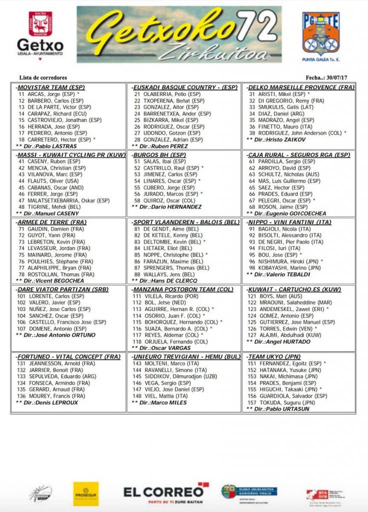 Los equipos participantes son Movistar (world tour), los profesionales Caja Rural-Seguros RGA, Delko, Fortuneo, Postobón, Nippo y Sport Vlaanderen Baloise y los continentales Euskadi Basque Country Murias, Burgos-BH, Armée de Terre, Kuwait-Cartucho.es, Unieuro, Kuwait Massi, Ukyo y Dare Viator Partizan.