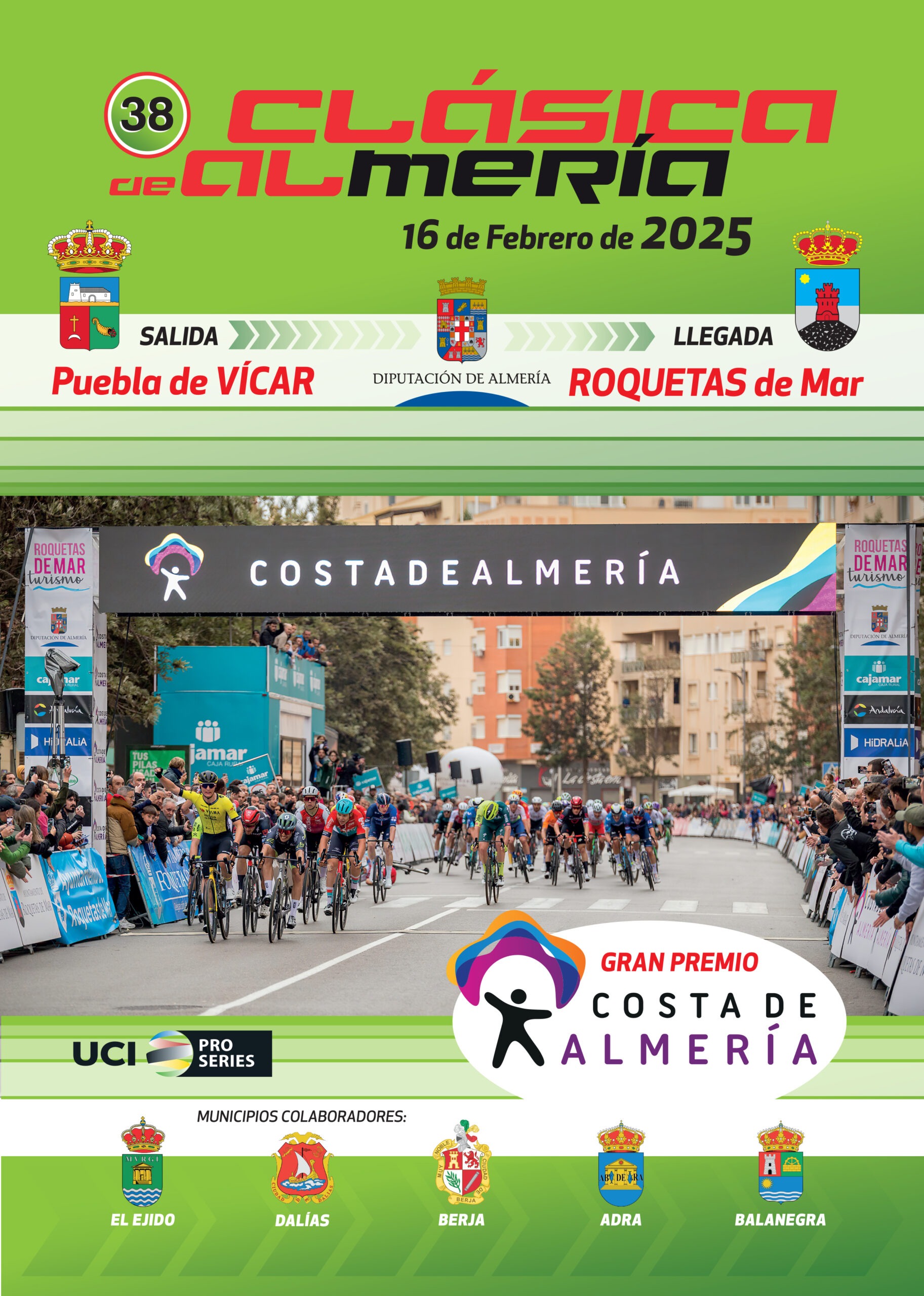La Clásica de Almería masculina cumple su 38ª edición. Partirá desde Puebla de Vícar, en el corazón del Poniente, y terminará en la Av. Juan Carlos I de Roquetas de Mar tras atravesar los siete municipios de la comarca. Arnaud De Lie, Arnaud Démare y Matteo Moschetti -que, en caso de ganar, se convertiría en el ciclista con mejor palmarés de la historia de la carrera- serán los principales favoritos al triunfo.