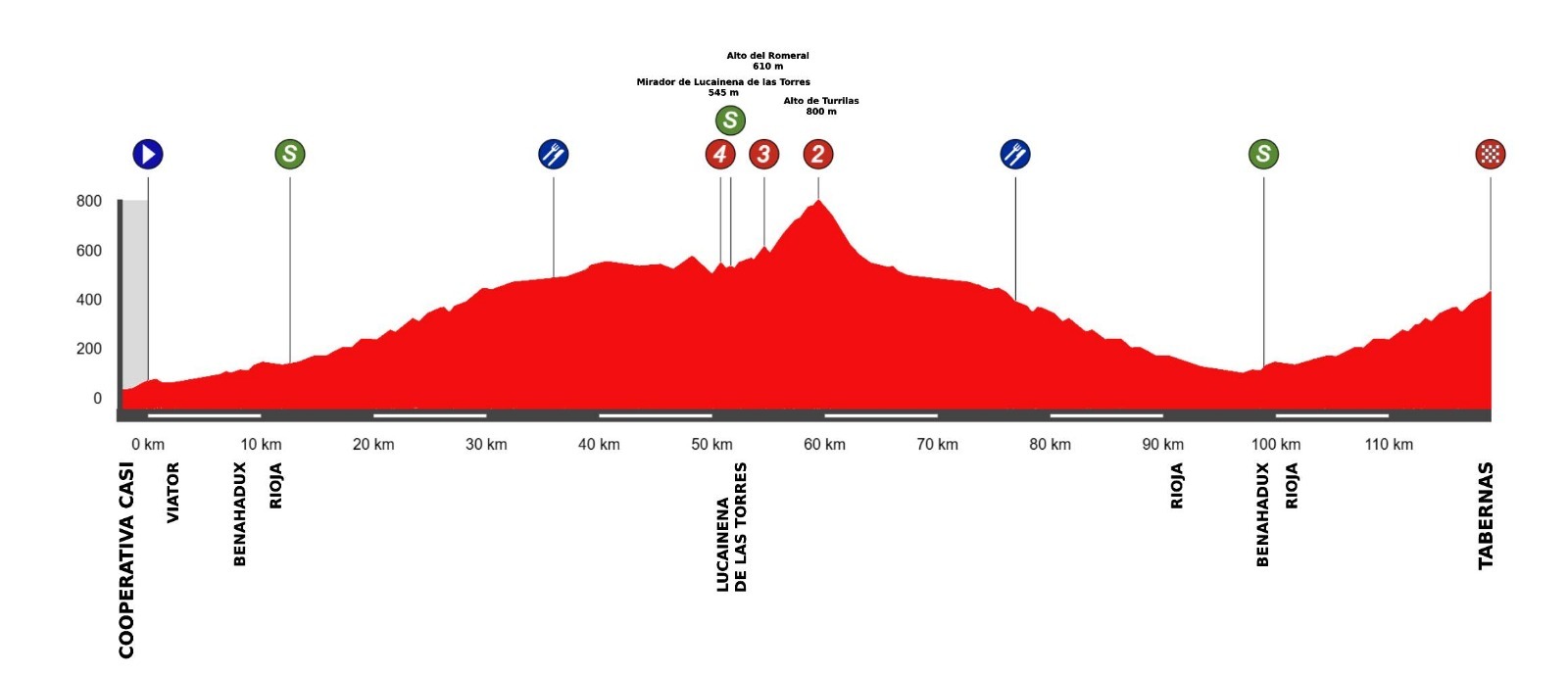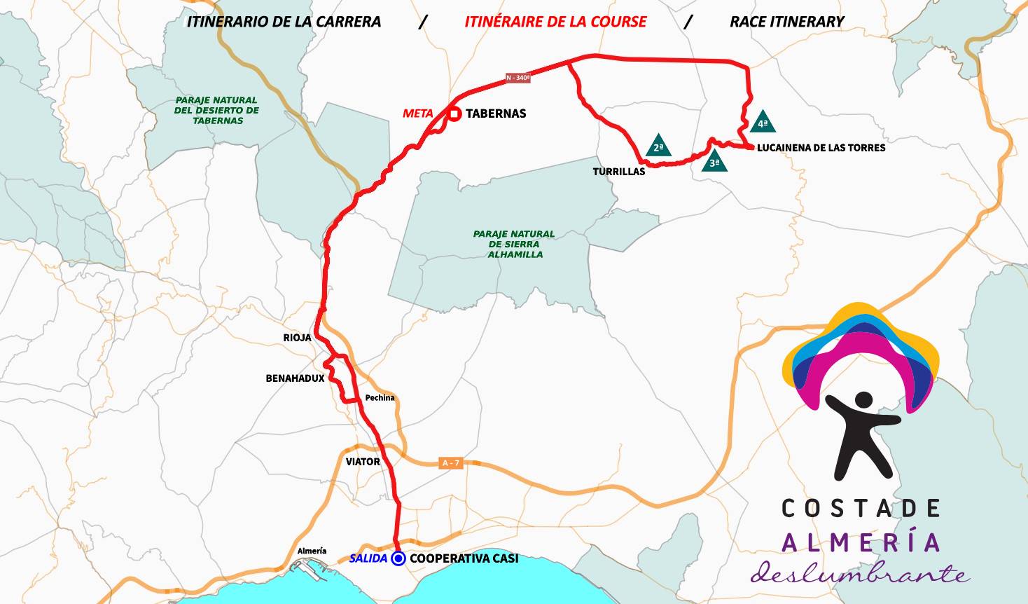 Una carrera que saldrá desde las instalaciones de la cooperativa CASI en el término municipal de Almería capital para llegar a la singular localidad de Tabernas, con una parte central que concentrará toda la dureza y donde el pelotón se puede romper en cualquier momento. El comienzo será ascendente casi desde la salida, con el paso por los municipios de Viátor y Benahadux antes de llegar a Rioja, donde se disputará el primer sprint intermedio.
