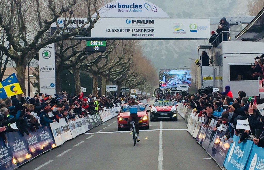 Al igual que en la clásica más importante del día, el Circuito Het Nieuwsblad, el intensísimo frío que está congelando los termómetros de media Europa, fue el gran protagonista de una Clásica Ardèche que apenas superó los 0 grados en todo el día, algo que no desanimó a Romain Bardet (Ag2r-La Mondiale) para lanzar un loco ataque a 20 kilómetros de meta para llevarse un agónico y precioso triunfo.