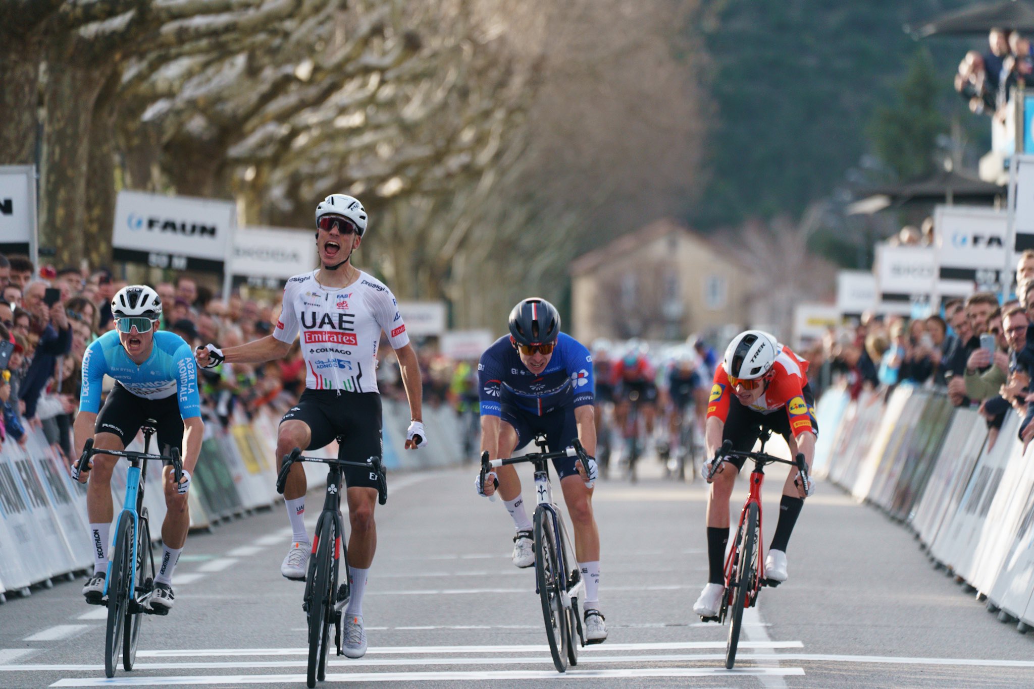 Mattias Skjelmose: «Estoy contento, lo hicimos muy bien como equipo. Teníamos un plan y lo ejecutamos a la perfección. Desafortunadamente, al final no tenía las piernas. Fui muy fuerte en la subida larga, tal vez la más fuerte allí, eso es lo que esperábamos. Al final me faltó el esfuerzo anaeróbico y eso tiene sentido porque venía de altura. Estoy muy contento con cómo hemos trabajado como equipo y con el hecho de que hayamos conseguido al menos un podio. Tácticamente no había nada diferente que pudiera haber hecho, simplemente no tenía más en las piernas. Pensé que sería el más rápido, pero desafortunadamente no lo fui y eso depende de mí. El plan era entrar en la larga subida en una buena posición y Amanuel [Ghebreigzabhier] marcó el ritmo, lo hizo perfectamente. Luego ataqué y solo Ayuso pudo seguirlo, pero desafortunadamente Romain y Félix regresaron y los seguimos hasta la línea de meta. Un día como hoy es una preparación perfecta para el resto de la temporada con muchos esfuerzos poderosos. No es el peor día para faltar algo en el lado anaeróbico. La cooperación fue bastante buena. Félix [Gall] intentó saltarse algunas curvas, pero lo entiendo porque sobre el papel era el más lento en el sprint, y jugó de forma inteligente con algunos buenos ataques. También Romain lo jugó bien, pensé que había terminado y al final tuvo un buen sprint. Por lo demás, creo que Juan [Ayuso] y yo hemos dado la mayor cantidad de vueltas, pero eso es lo que se puede esperar cuando fuimos quizás los más fuertes en la larga subida. No estoy mejor de lo que esperaba, pero estoy en línea con mis expectativas. Hicimos muchos esfuerzos largos en los entrenamientos, y se puede ver el resultado de eso en la larga subida. Los esfuerzos anaeróbicos siempre los necesito para conseguir un poco en las carreras, así que todo va según lo planeado».