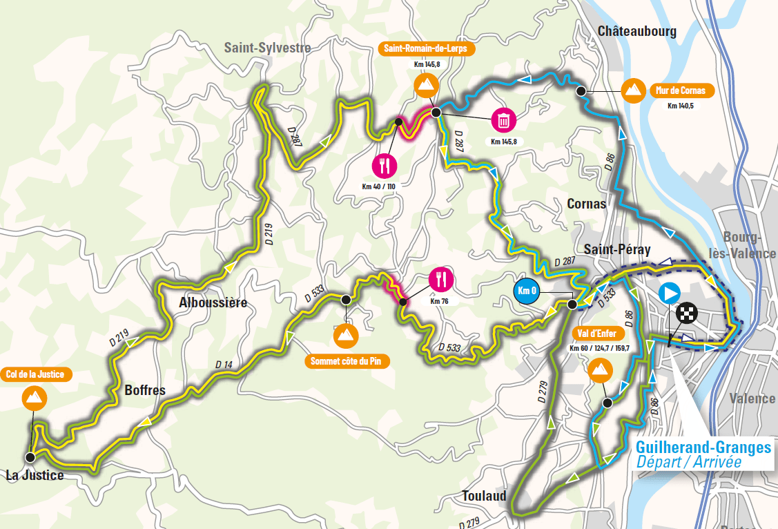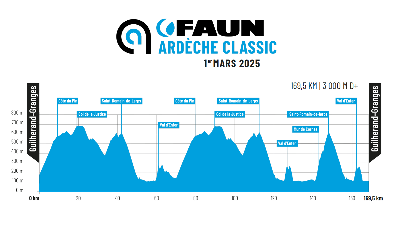La Clásica Ardéche 20205 ya ha dado a conocer su recorrido, su perfil y su mapa de la edición de este año, que tendrá lugar el 1 de marzo y que no presenta ninguna innovación importante, en términos de recorrido, respecto a las últimas ediciones. Tendrá como punto de partida y llegada la ciudad de Guilherand-Granges, habrá 3.000 metros de desnivel y constará de un total de 169,5 kilómetros.