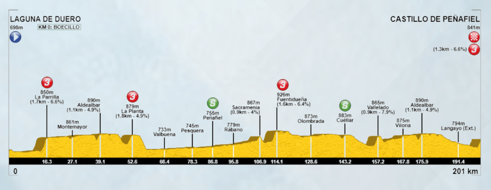 Los próximos kilómetros se fundamentarán en un terreno llano sin dificultades recorriendo Valbuena, Pesquera o Rábano, además de realizar un paso próximo a la meta por Peñafiel, que es dónde estará situado el primer esprint intermedio de la carrera en el kilómetro 86. Superados los 100 kilómetros, el pelotón regresará a un tramo con mayor exigencia y varias rampas. Comenzarán la subida desde Sacramenia y coronarán el último puerto puntuable de la jornada, Fuentidueña (1,6 km al 6,4%), tercera categoría.