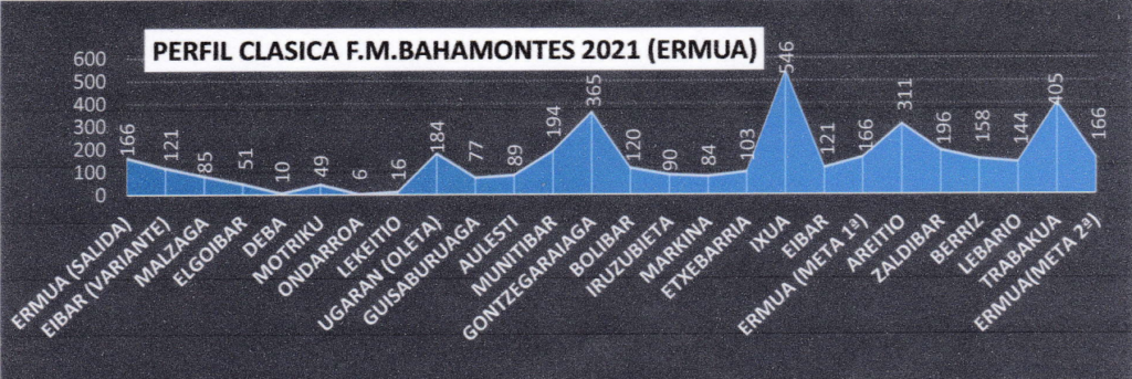 Los que se animaron a participar tomaron la salida desde Ermua, se va por Éibar por la variante hasta Deba y por la costa se pasó por Motriku, Ondarroa y Lekeitio. A continuación el recorrido siguió por el alto de Ugaran (Oleta), el alto de Gizaburuaga para seguir luego por las localidades de Aulesti, Bolibar, Iruzubieta, Markina y Etxebarria y a partir de ahí empezó el plato fuerte de la ruta, subiendo el puerto de Ixua, de 1ª categoría, para bajar a Éibar por la variante, y llegada a Ermua con la etapa pequeña de 90 km.