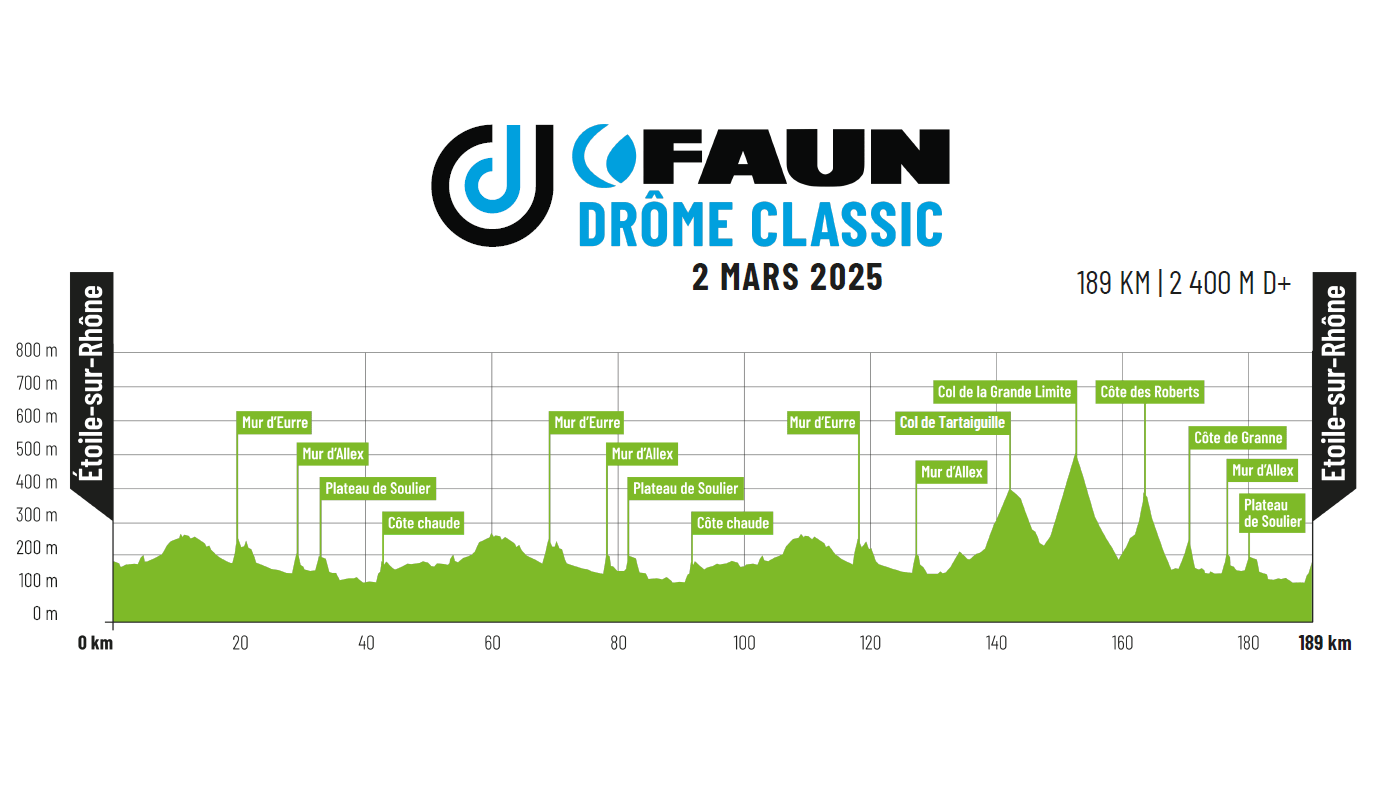 El domingo 2 de marzo tendrá lugar la Clásica Drôme, la segunda de las dos Boucles y que llegará un día después de la Clásica de Ardèche. Serán 189 kilómetros en los que los corredores deberán superar 2.400 metros de desnivel. Al igual que en años anteriores, la clave de la carrera volverán a ser esas colinas cortas, pero exigentes, estando muchas de ellas cerca de la meta, en torno a la localidad de Étoile-sur-Rhône, desde donde arrancará y también donde acabará la carrera.