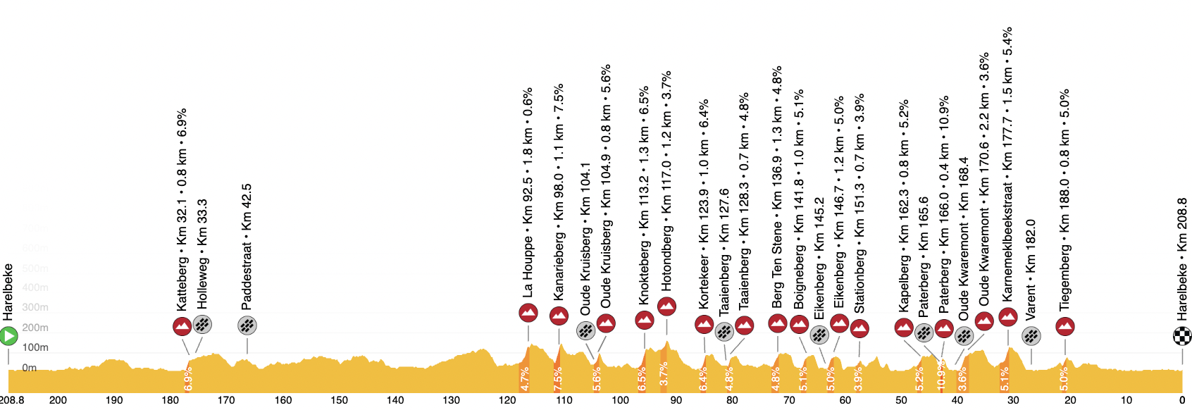 En los primeros kilómetros, se produjo un corte en el pelotón. Sobre la parte delantera del paquete, marcharon unos 50 hombres de los que destacan algunos como Declerq, Stuyven, Christen, González, Steimle o Townsend. Mientras que el grupo de Ganna, Pedersen, Mohoric, Van der Poel y Van Aert perdía unos 2:30 minutos a falta de 177 km para la meta. Una distancia que fueron recortando poco a poco gracias al trabajo intenso de equipos como Red Bull o Alpecin, hasta lograr la fusión de nuevo a falta de 111 km para la meta, justo por el paso por las duras rampas de Kanarieberg y poco antes de afrontar los primeros tramos de adoquines que suelen marcar la diferencia en esta carrera.
