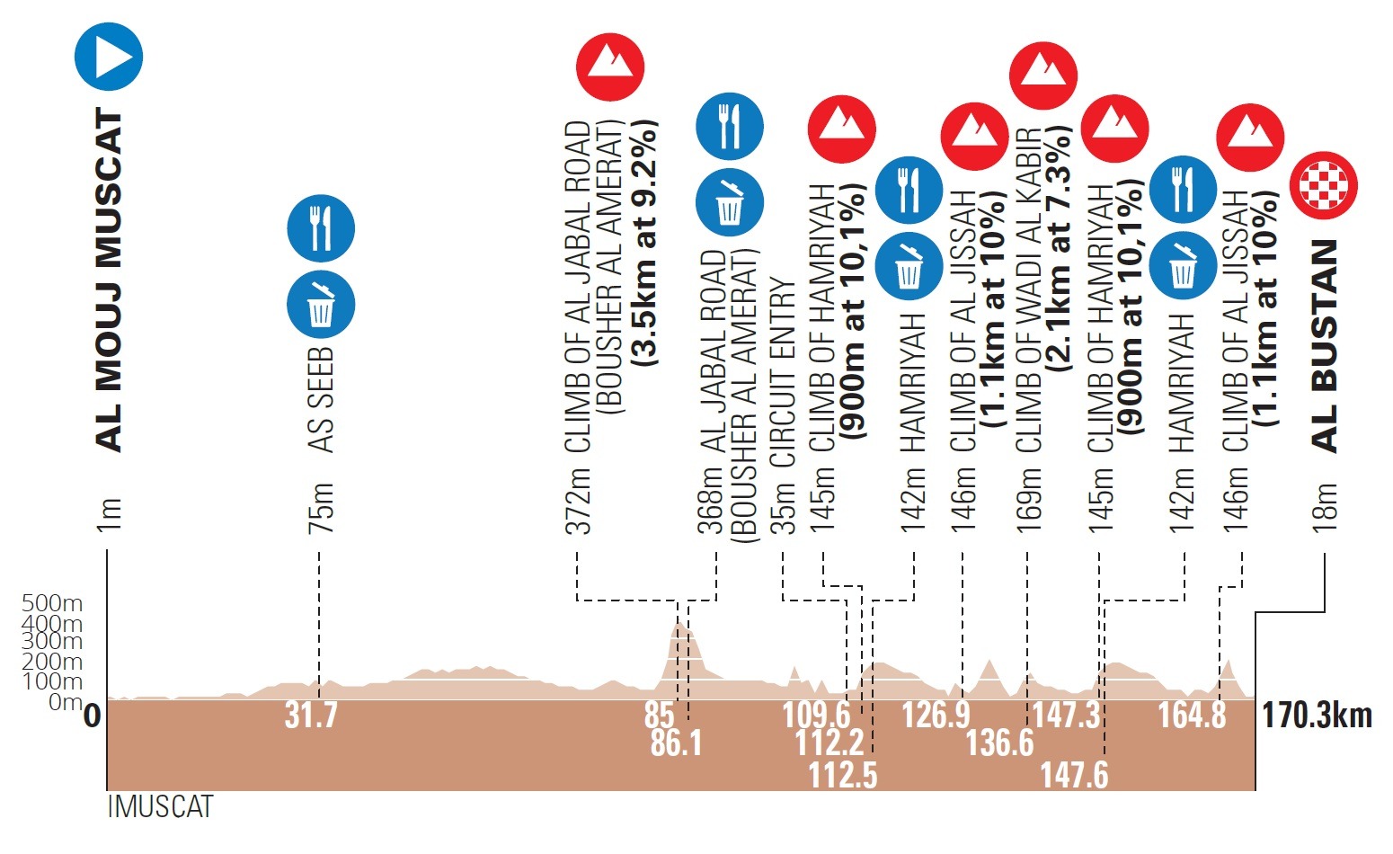 En su 3ª edición, la Muscat Classic (7 febrero) mantiene su recorrido montañoso entre Al Mouj y Al Bustan, con un nervioso final marcado por las subidas de Bousher Al Amerat (3,4 km al 8,8%), Wadi Al Kadir (2,1 km al 7,3%), Al Hamriyah (0,8 km al 9,8%) y Al Jissah (1,4 km al 9%). Esta secuencia de subidas fue testigo de la victoria en solitario de Finn Fisher-Black el año pasado, antes de conseguir una victoria de etapa en el Tour de Omán, en Qurayyat.
