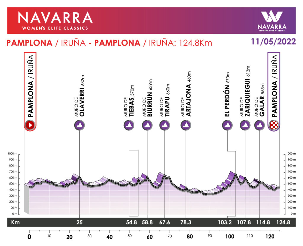 La 4ª edición de la Clásica Navarra (1.1) tendrá lugar el miércoles 11 de mayo. La prueba navarra presenta un recorrido de 124,8 km, con salida y llegada en Pamplona. A diferencia de la carrera del día anterior, la Emakumeen Nafarroako, la Clásica presenta un perfil no tan montañoso, sino que se disputa en un terreno más quebrado. Los puertos de entre 5 km y 10 km son sustituidos por cotas de un máximo de 3 km, lo que abre el abanico de favoritas a más ciclistas. Las participantes tendrán que ascender un total de 8 cimas: Olaverri (de 1,7 km al 5,4% y pendiente máxima del 21%), Tiebas (0,9 km al 8,2%), Biurrun (0,65 km al 10,3% y máxima del 21%), Tirapu (3,1 km al 6,2%), Artajona (0,5 km al 10,4% y máxima del 18%), El Perdón (3,1 km al 6,1%), Zariquiegui (2,1 km al 8,2%) y Galar (0,5 km al 10,7% y rampa máxima del 21%), que se coronará a falta de 10 km para la línea de llegada.