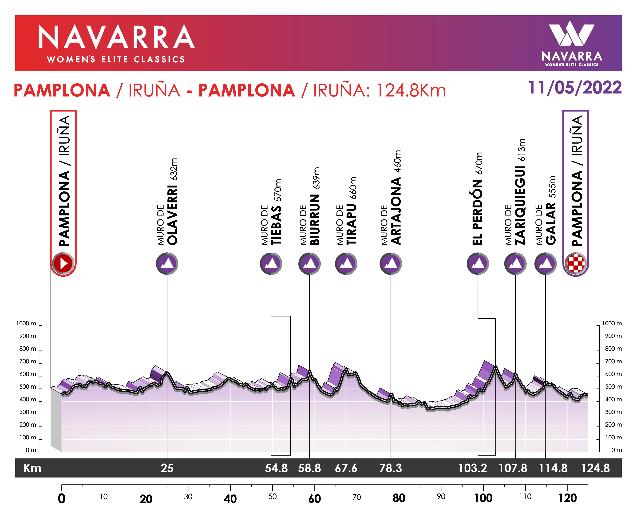 La 4ª edición de la Clásica Navarra (1.1) tendrá lugar el miércoles 11 de mayo. La prueba navarra presenta un recorrido de 124,8 km, con salida y llegada en Pamplona. A diferencia de la carrera del día anterior, la Emakumeen Nafarroako, la Clásica presenta un perfil no tan montañoso, sino que se disputa en un terreno más quebrado. Los puertos de entre 5 km y 10 km son sustituidos por cotas de un máximo de 3 km, lo que abre el abanico de favoritas a más ciclistas. Las participantes tendrán que ascender un total de 8 cimas: Olaverri (de 1,7 km al 5,4% y pendiente máxima del 21%), Tiebas (0,9 km al 8,2%), Biurrun (0,65 km al 10,3% y máxima del 21%), Tirapu (3,1 km al 6,2%), Artajona (0,5 km al 10,4% y máxima del 18%), El Perdón (3,1 km al 6,1%), Zariquiegui (2,1 km al 8,2%) y Galar (0,5 km al 10,7% y rampa máxima del 21%), que se coronará a falta de 10 km para la línea de llegada.