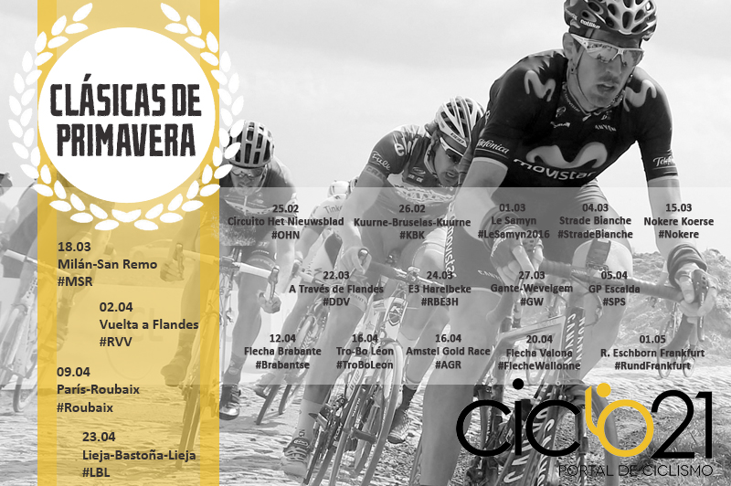 Milán-San Remo (18 de marzo), Vuelta a Flandes (2 de abril), París-Roubaix (9 de abril) y Lieja-Bastoña-Lieja (23 de abril) son los cuatro Monumentos que tienen lugar en esta época, pero, ni mucho menos, son los únicos atractivos que presenta la parte de la temporada que dará paso, una vez que se apaguen los gritos en las colinas de las Ardenas, a un Giro de Italia que, como todos los años, anunciará la llegada del verano ciclista.