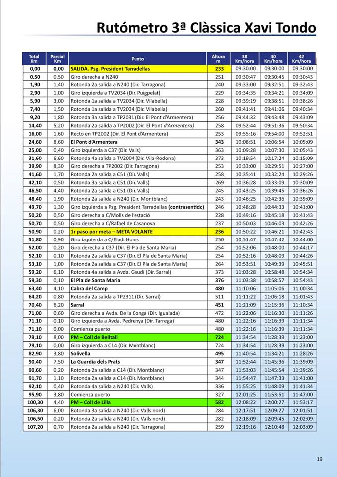 El pelotón Élite-Sub23 tendrá que hacer frente en la Classica Xavi Tondo a 172 exigentes kilómetros, con salida y llegada en Valls, en los que tendrán que superar un doble ascenso al Coll de Belltal, de tercera categoría y al Coll de Lilla, de segunda categoría. El último paso por Lilla se efectuará a tan solo 10 km de la conclusión y será a buen seguro el juez que resuelva la carrera a pesar de que no cuenta con rampas excesivamente exigente y su pendiente se mantiene muy constante en torno al 5%. Una sprint entre un pelotón reducido o que una pequeña avanzadilla de dos o tres corredores se haga con la gloria, como sucedió el pasado año con el triunfo de Grigoryev, parecen los finales más factibles.