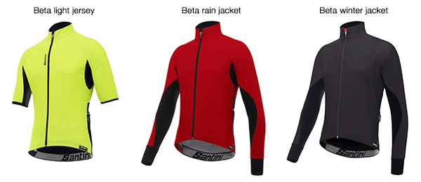 Para encarar las variaciones meteorológicas y contar con una sola capa que pueda satisfacer las exigencias del ciclista, Santini propone la línea Beta, que en 2018 se incrementa con tres prendas para hombre y una para mujer. Maillots y chaquetas con diversas características y pesos, para ofrecer una protección en todas las condiciones meteorológicas, en primavera, otoño e invierno.