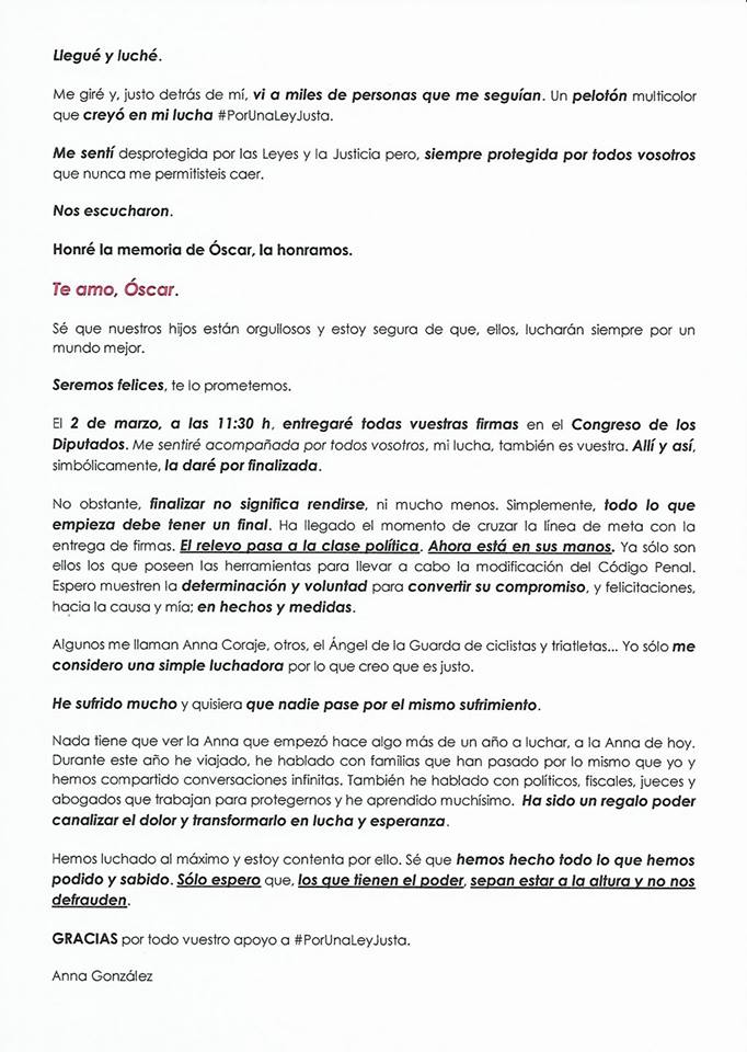 Desde entonces Anna González se ha reunido con todos los Grupos Parlamentarios en el Congreso de los Diputados y ha sido recibida por el ministro de Justicia, sin que se haya modificado nada legalmente.
