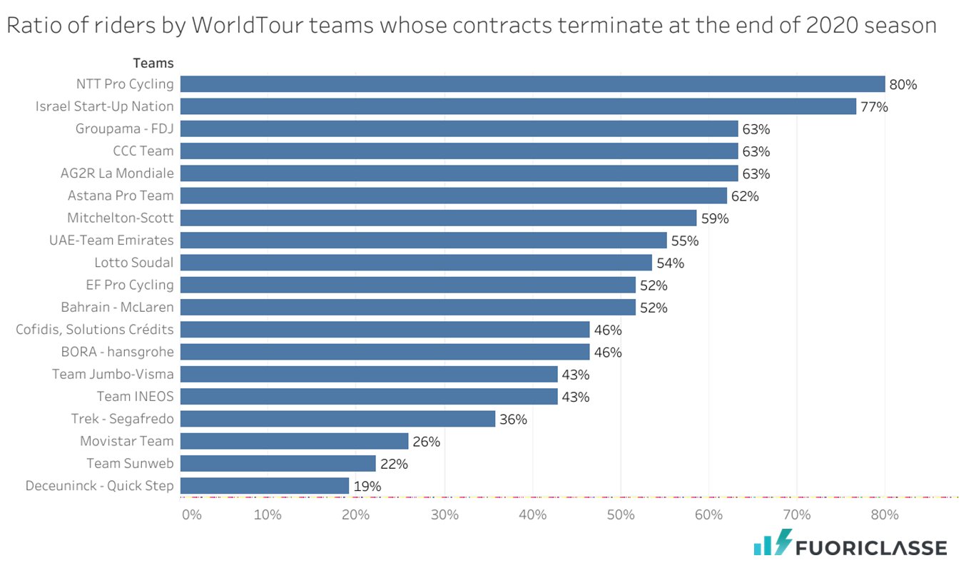 Si miramos la gráfica y la comparamos con la lista completa de los corredores que están sin contrato en 2021, nos damos cuenta que, por ejemplo, el CCC tiene ocupado para ese 2021 año tan solo el 37%. El riesgo, por tanto, de cerrojazo es altamente probable si la coyuntura económica que se avecina se mantiene a la baja, liquidando tan solo a ese porcentaje mínimo al final de la temporada y soltando un plantel de corredores en el mes de noviembre sin capacidad de reacción, en algunos casos.