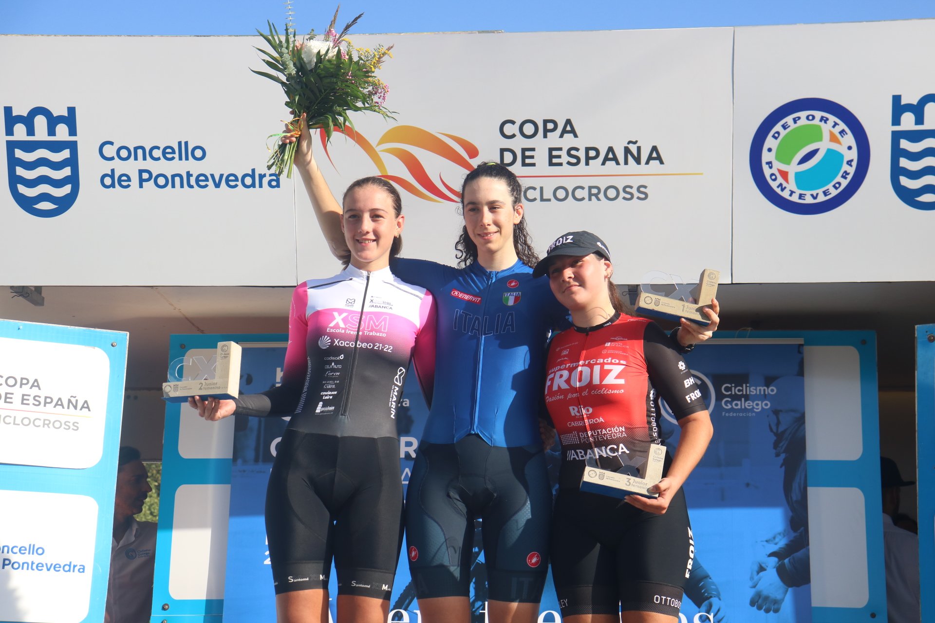 Entre las féminas, la tónica fue muy parecida a la carrera de sus homólogos masculinos. Las italianas Federica Venturelli y Valentina Corvi vivieron un bonito duelo con las gallegas Uxía Soto y María Filgueiras. Ante los problemas mecánicos de Corvi, quedó el trío en cabeza y todo se decidió en la última vuelta, a pesar de los intentos de Soto por despegarse del grupo. Finalmente, la del Froiz pagó el esfuerzo y Filgueiras y Venturelli se disputaron el sprint, cayendo del lado de la italiana. Por su parte, Aroa Otero, quien tuvo una caída al inicio, llegó en quinta posición y mantiene el maillot de líder.
