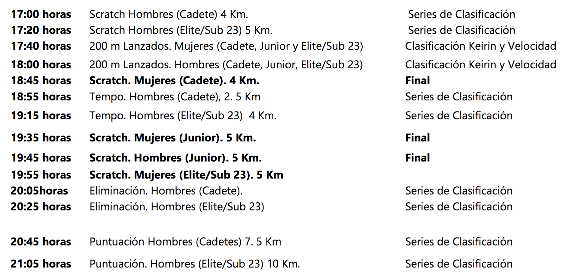 El programa de competiciones de la Copa de España se iniciará el sábado 10:00 a las 16:00 horas e incluirá pruebas de 200 metros lanzados, scratch, velocidad, puntuación para las categorías Cadete, Júnior, Elite/Sub 23 masculina y femenina.