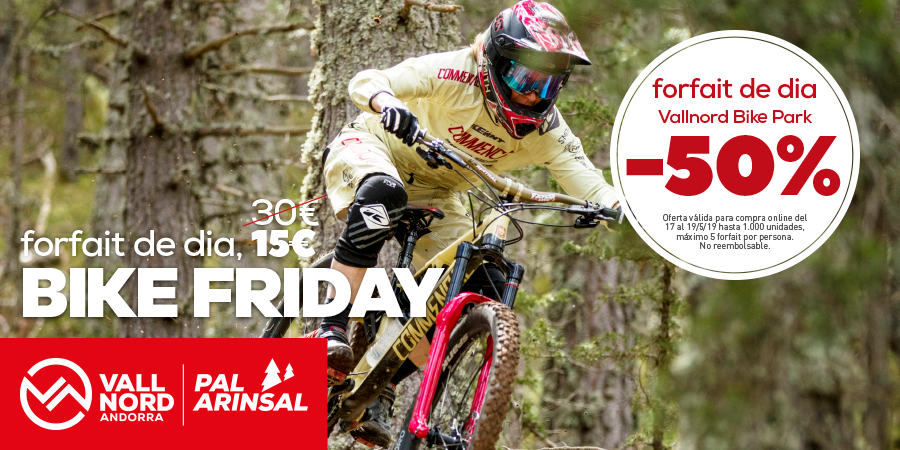 A partir de las 9 h del viernes 17 de mayo y hasta el domingo, 19 de mayo, Vallnord-Pal Arinsal pondrá en marcha la segunda edición de la versión estival del Black Friday. Serán tres días en el que todos los usuarios podrán adquirir el forfait de adulto de un día para Vallnord Bike Park la Massana con una reducción en el precio del 50%.
