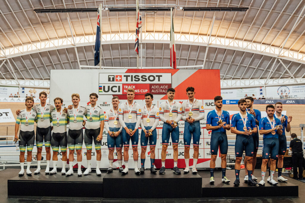 Con las victorias en la persecución masculina y en la velocidad femenina, Gran Bretaña logró dos triunfos en la primera jornada de la Copa de las Naciones de Adelaida, dedicada fundamentalmente a las pruebas por equipos, donde también triunfaron la cuarteta femenina neozelandesa y el trío de velocidad australiano. También se disputaron las eliminaciones, con victorias para el canadiense Dylan Bibic y la neozelandesa Ally Woolaston, que lograba así su segundo oro del día, en la única prueba con presencia española donde Laura Rodríguez terminaba en el puesto decimotercero.