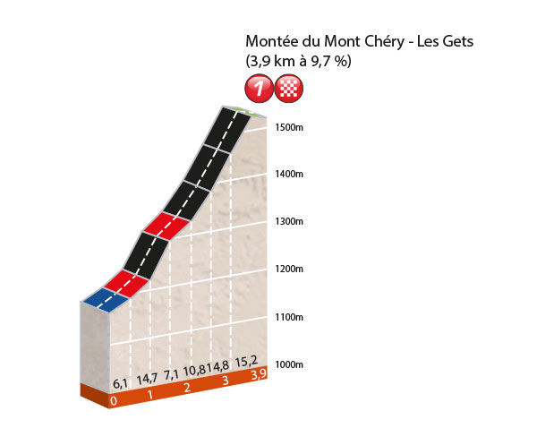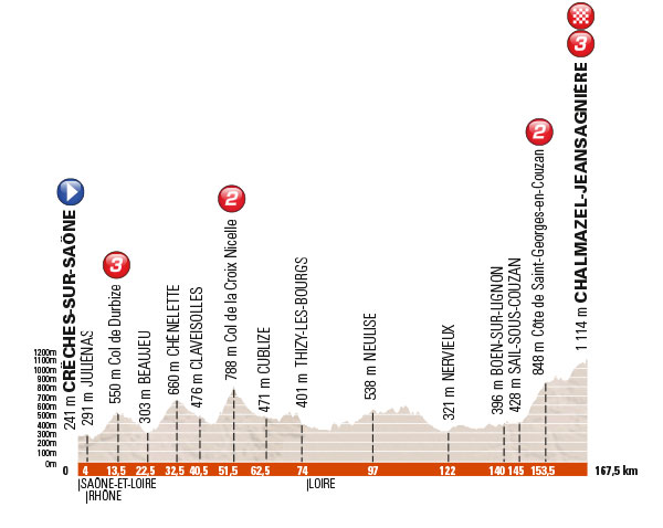 El primer final en alto llegará ya en la segunda etapa, con ese final en Chalmazel-Jeansgnière, un alto de tercera categoría de poco menos de siete kilómetros al 3,7% y un tramo de mayor dureza al 6,4% ya en la parte final. Este alto completará una jornada de 167 kilómetros en la que también se ascenderán el Col de Durbize (3ª categoría) y la Croix Nicelle y Saint-Georges-en-Couzan (2ª categoría), siendo este último una suerte de prólogo a la úlima ascensión ya que entre ambas apenas se contarán un centenar de metros descendentes.