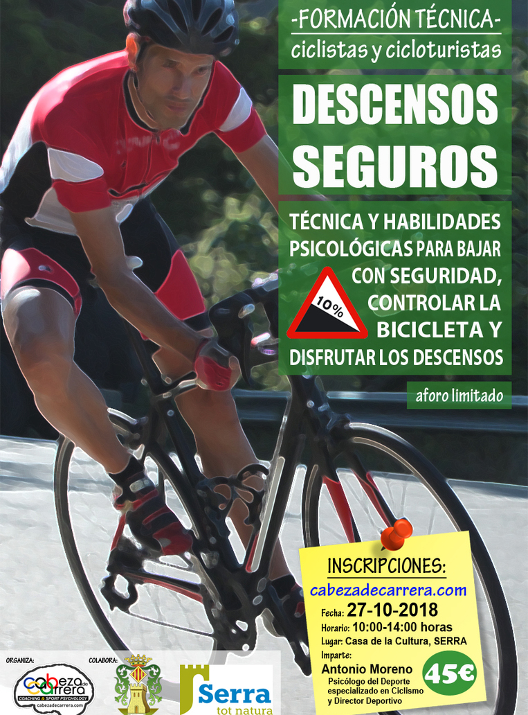 El próximo 27 de octubre, en la Casa de la Cultura de Serra (Valencia), se va a celebrar el curso de formación ‘DESCENSOS SEGUROS‘, dirigido a ciclistas y ciclodeportistas de carretera de todas las edades y niveles.