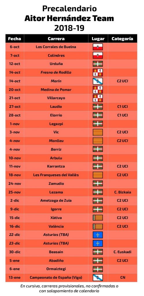 Vic, Manlleu y Les Franqueses del Vallès, todas ellas C2 UCI, serán las tres pruebas catalanas en las que Aitor Hernández estará, en principio, presente. Karrantza, Zuia, Igorre y —ya en enero— Abadiño, también todas C2 UCI, completan el calendario vasco internacional, que Aitor Hernández complementará con la participación en las carreras internacionales de Xàtiva y de València, a mediados de diciembre, ambas de categoría C2 UCI.