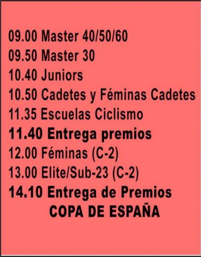 Organizado por la Fundación Deportiva Municipal y la Penya Ciclista Campanar, el programa arranca el sábado a las 15:00 horas con los entrenamientos oficiales. El domingo abrirán el fuego los máster 40/50/60 a partir de las 9:00. La competición se cerrará a las 13:00 con la carrera élite y sub-23 masculina, tras la cual se procederá a la entrega de premios. Entre los favoritos a la victoria figuran Aitor Hernández y Javier Ruiz de Larrinaga y, por supuesto el alicantino Felipe Orts.