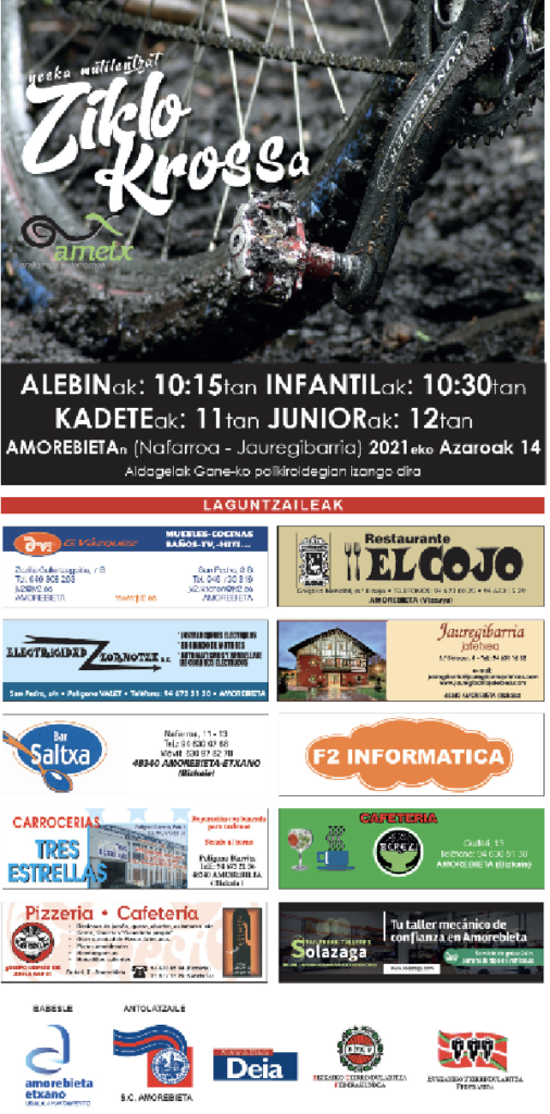 El Ciclocross de Zornotza en la localidad vizcaína de Amorebieta-Etxano celebrará el domingo 14 de noviembre una nueva edición en la que se podrán dar citas corredores de las categorías de escuelas, cadete y júnior, tanto masculinas como femeninas. La primera salida está prevista a las 10.15 horas.