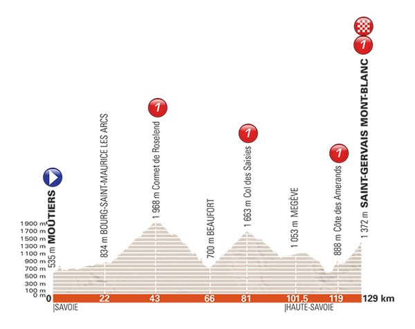 La primera gran criba llegó en el Col du Pre (fuera de categoría), encadenado con el Cormet de Roselend (2ª categoría). En cabeza se consolidarion Bilbao, Boswell, Barguil y Grmay, mientras en el grupo de favoritos Vincenzo Nibali y Michal Kwiatkowski empezaban a mostrar signos de debilidad. Por su parte, Marc Soler sufrió una avería mecánica que le hizo completar la ascensión adelantando a los corredores descolgados que no tenían en mente pelear por la etapa. Pierre Roger Latour (Ag2r) y Dani Navarro (Cofidis) saltaron en busca del grupo cabecero. El francés conectó pronto, pero el salmantino-asturiano no logró su objetivo. En la cima del puerto Carretero, Conti, Power, Molard y Latour completaron el grupo de nueve que afrontó el vertiginoso descenso, en el que Romain Bardet intentó sorprender apurando en las curvas de herradura y exhibiendo una depurada técnica que al final no le sirvió para unirse a la fuga. El líder, Geraint Thomas, rodaba tranquilo, escudado ‘sólo’ por Tao Geoghegan Hart y un sorprendente Jonathan Castroviejo, que se vació hasta que explotó a 10 para meta.