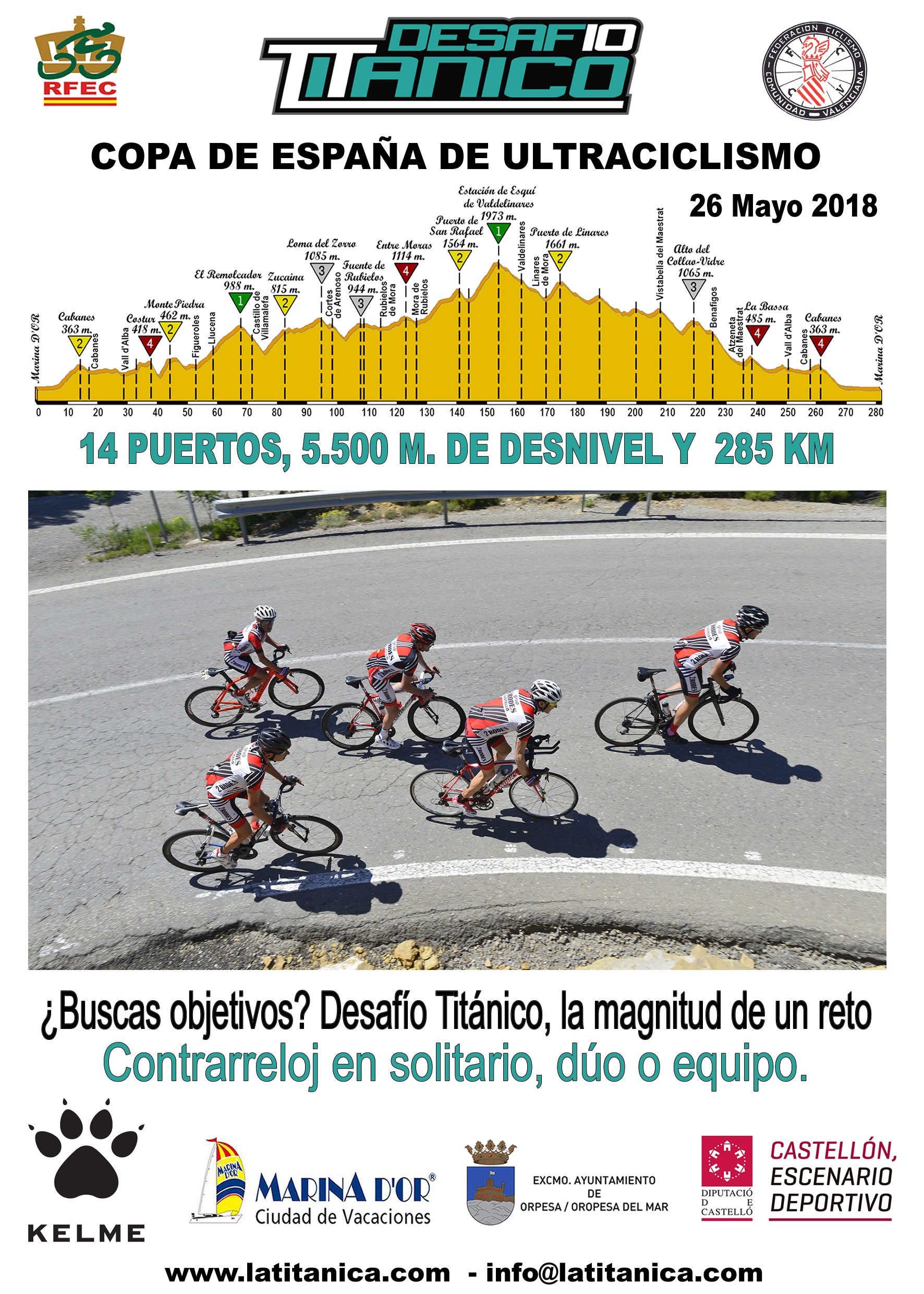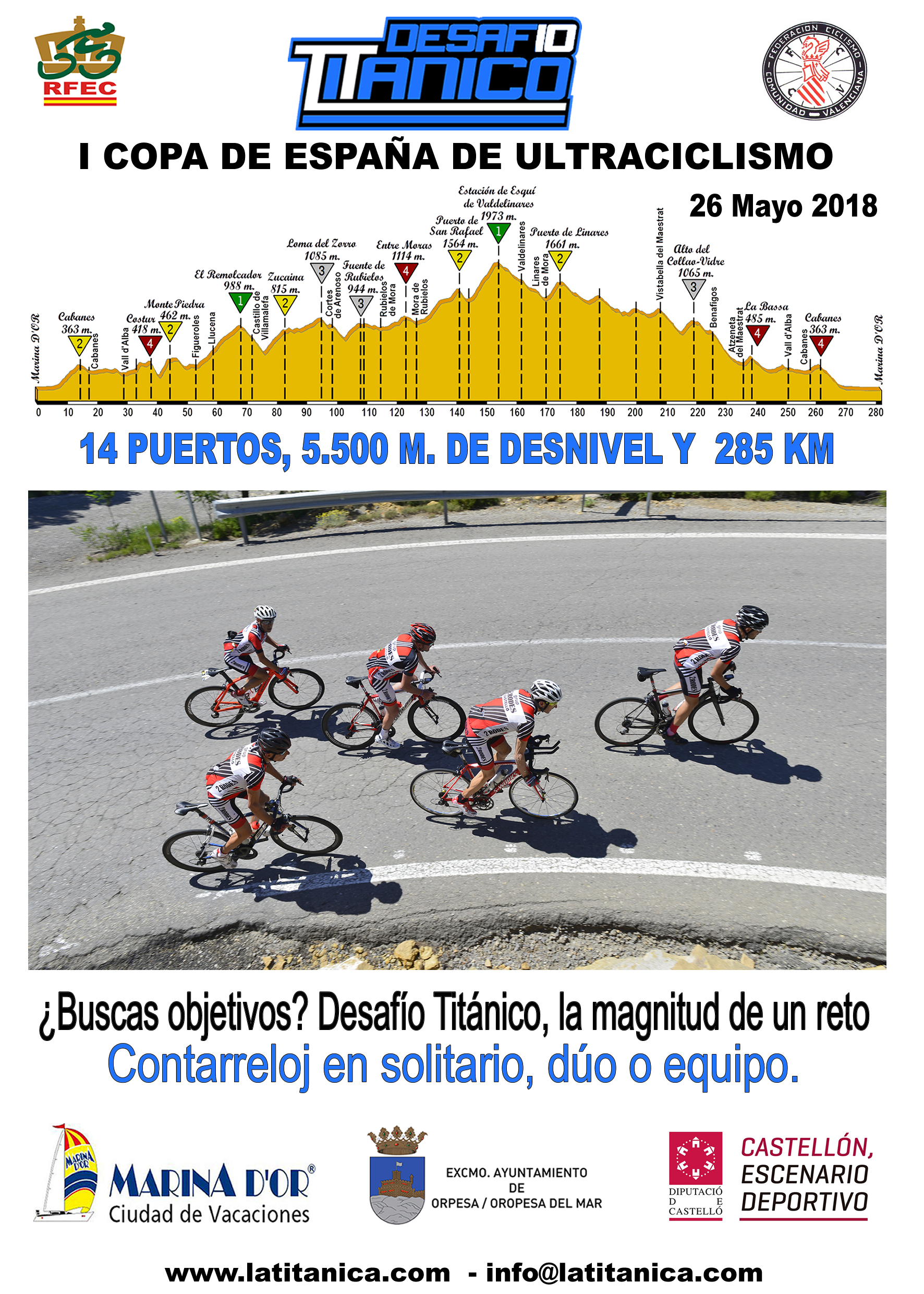 Ya están abiertas las inscripciones para un enorme desafío en un formato novedoso, el Desafío Titánico que formará parte de la naciente Copa de España de Ultrafondo de la Real Federación Española de Ciclismo, nueva disciplina ciclista de ultrafondo en carretera aprobada en julio de 2017 por la RFEC. Una carrera en la compiten juntos hombres, mujeres y equipos mixtos de todas las edades en las modalidades de solitario, dúo y equipos de 4 a 8 integrantes que a la vez se divide en masculino, femenino y mixto para los ciclistas Élite, Sub23 y máster 30 – 40 – 50 y 60. Es la única disciplina en ciclismo en la que se pueden competir en dúos o equipos mixtos, y lo harán en una ruta de 285 km. con 14 puertos y cerca de 6.000 metros de desnivel positivo y que se disputará con el tráfico cerrado. La fecha prevista para su celebración es el 26 de mayo de 2018. Track de la ruta