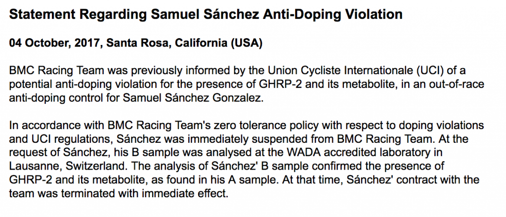 En ese mismo comunicado, el que fuera corredor de BMC en el momento de su control adverso ratifica “mi confianza en los controles antidopaje a los que los atletas estamos sujetos, habiendo realizado cientos de ellos en mis 17 años de carrera como ciclista profesional, si bien expongo, los riesgos externos a los que estamos expuestos, tal y como ha sucedido en mi caso. Quiero agradecer a mi equipo jurídico su trabajo dedicación y constancia durante todo el proceso”.