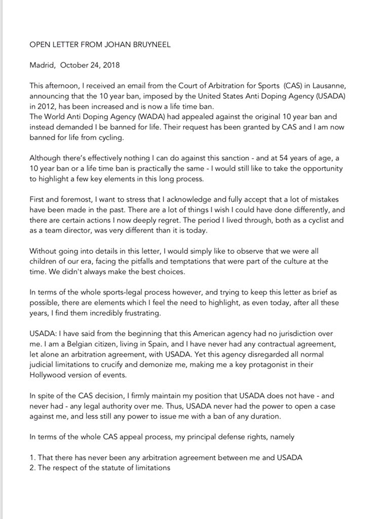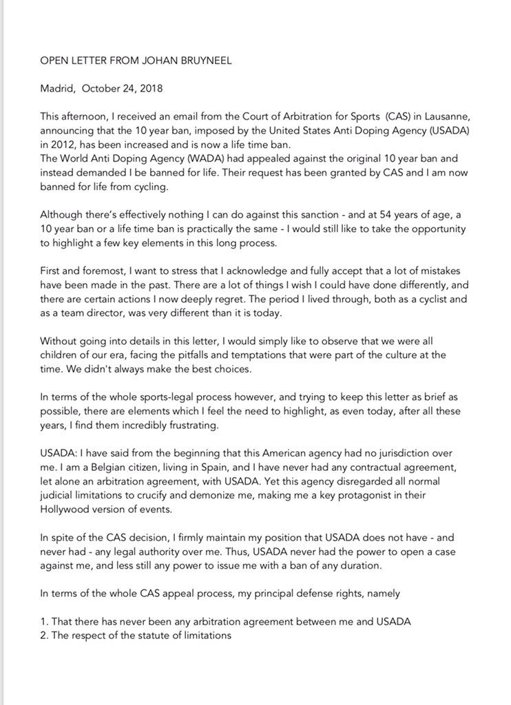 «En primer lugar, quiero subrayar que reconozco y acepto plenamente que se han cometido muchos errores en el pasado. Hay muchas cosas que desearía haber hecho de manera diferente, y hay ciertas acciones que ahora lamento profundamente El período que viví, tanto como ciclista como director de equipo, fue muy diferente al actual».