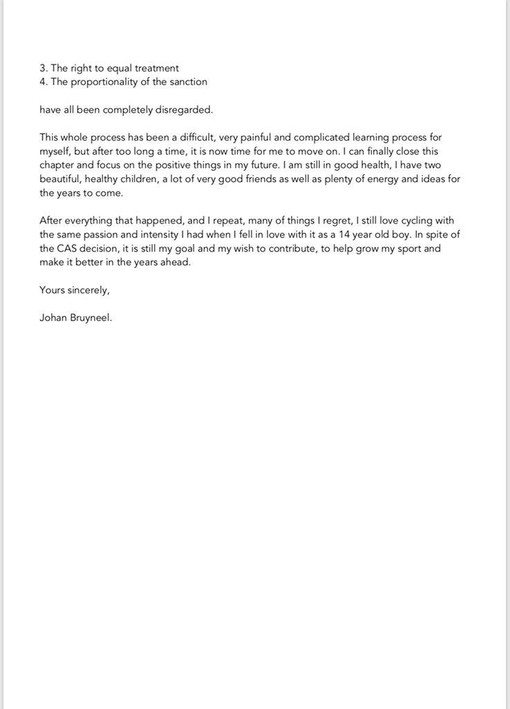 «Después de todo lo que sucedió, y repito, muchas de las cosas que lamento, todavía amo el ciclismo con la misma pasión e intensidad que tenía cuando me enamoré de él cuando tenía 14 años. A pesar de la decisión del TAS todavía es mi objetivo y mi deseo contribuir para ayudar a crecer mi deporte y mejorarlo en los próximos años».