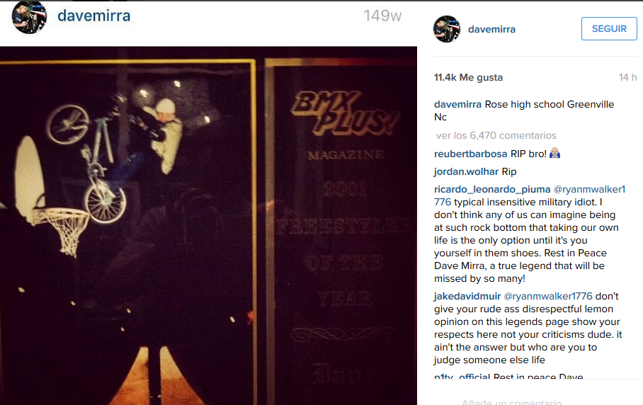 Justo antes de su muerte, Mirra había publicado dos imágenes en su cuenta de Instagram. En una de ellas aparece sonriente junto a su esposa con el mensaje ‘¡Mi roca!. Gracias Dios”. La otra instantánea corresponde a una foto de su niñez, cuando daba los primeros pasos en el BMX. En ella, el texto que la acompaña es un escueto “Rose High School, Greenville, Carolina del Norte”.