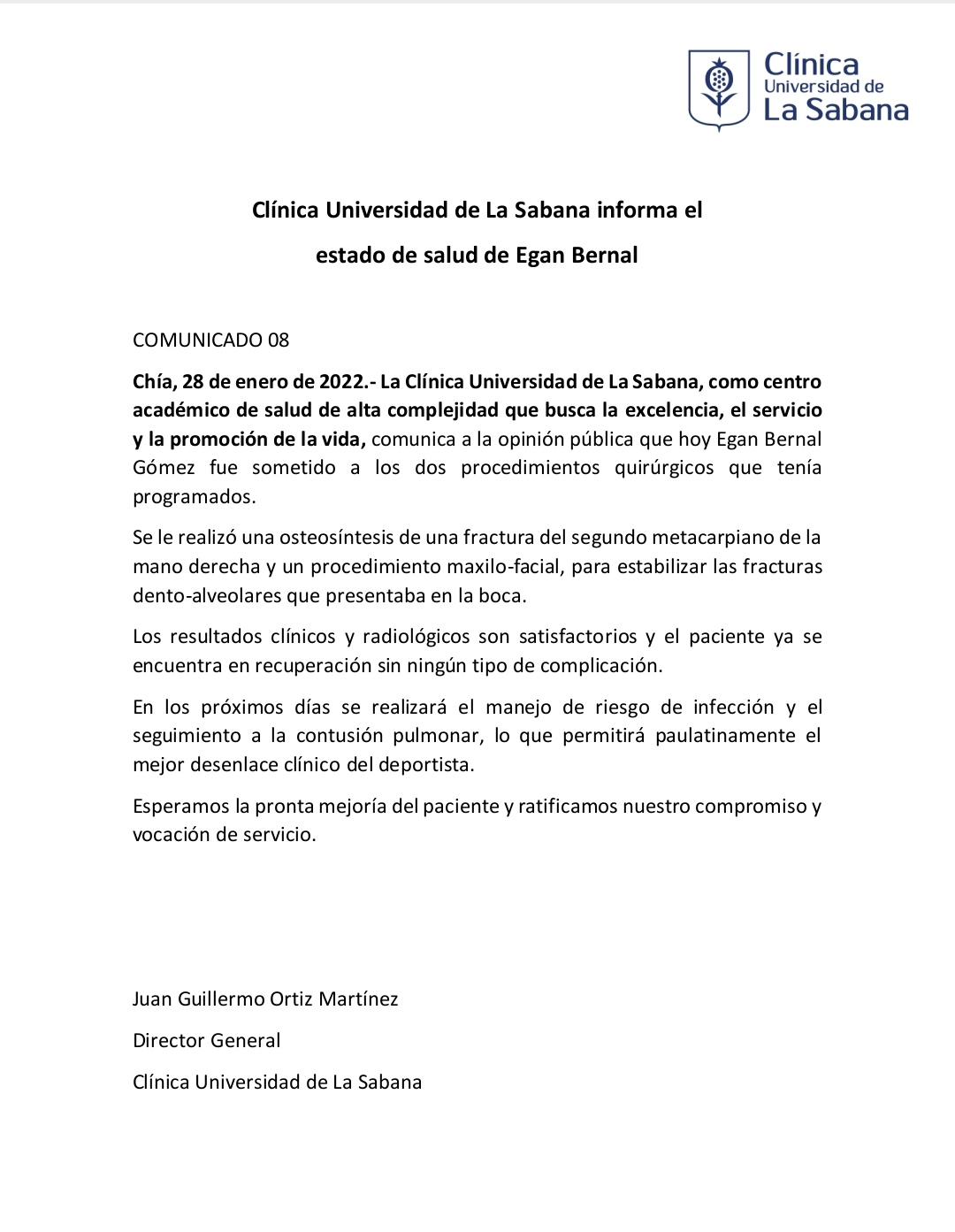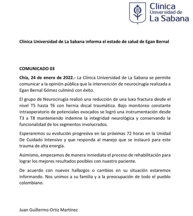“La Clínica Universidad de La Sabana, como centro académico de salud de alta complejidad que busca la excelencia, el servicio y la promoción de la vida, se permite comunicar a la opinión pública que el paciente Egan Bernal Gómez hoy ha continuado con la recuperación esperada y con una tendencia favorable.