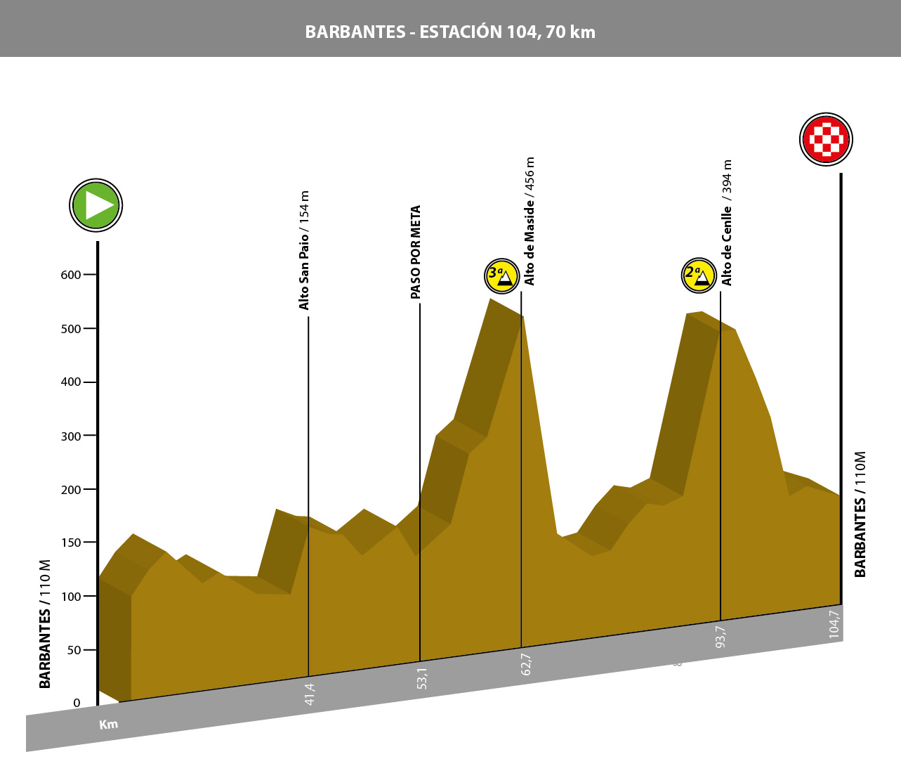 De este modo se presenta un recorrido de 104,6 kms., de los que los 4,9 primeros serán neutralizados, lo que determina un recorrido competitivo de 99,7 km (el máximo permitido para la categoría máster 40 es de 100 km), con dos puertos de montaña: el Alto de Maside, en el punto kilométrico 62,7, de 7 km de ascensión, con una pendiente media del 4,3%, y el Alto de Cenlle, en el punto kilométrico 93,7, de 5,0 km de ascensión y con una pendiente media del 5,4%, situado a 11 km de la línea de meta.