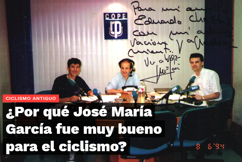 Para mí José María García era el líder indiscutible de la Vuelta. Con García, la carrera española vivió su época dorada. El seguimiento mediático era espectacular y las salas de prensa se quedaban pequeñas para albergar a tan alto número de profesionales de la comunicación. Primero en la modélica ANTENA3-RADIO y posteriormente en la CADENA COPE y en ONDA CERO, José María y su numeroso equipo se volcaban con la Vuelta. Nadie informaba tantas horas de la carrera, desde primera hora de la mañana hasta bien entrada la madrugada. El esfuerzo era grande, pero la recompensa no tenía precio. Tuve el privilegio de formar parte del equipo de García durante 11 ediciones de la Vuelta y debo reconocer que el ciclismo me lo ha dado casi todo.